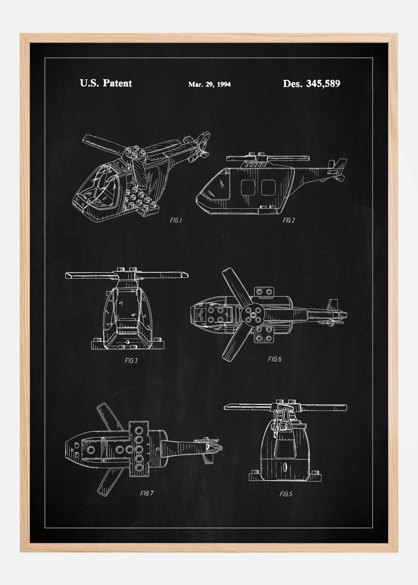 Tento patentový plakát představuje detailní řemeslné zpracování návrhu helikoptéry od Lega, které je chráněno americkým designovým patentem Des. 345,589, uděleným 29. března 1994. Plakát zobrazuje sérii technických výkresů z různých úhlů, které zachycují dynamickou a složitou povahu vozidla. Je to ukázka dokonalosti inženýrství a aerodynamiky, a vzdává hold těm, kdo přispívají k pokroku v oblasti letecké techniky.