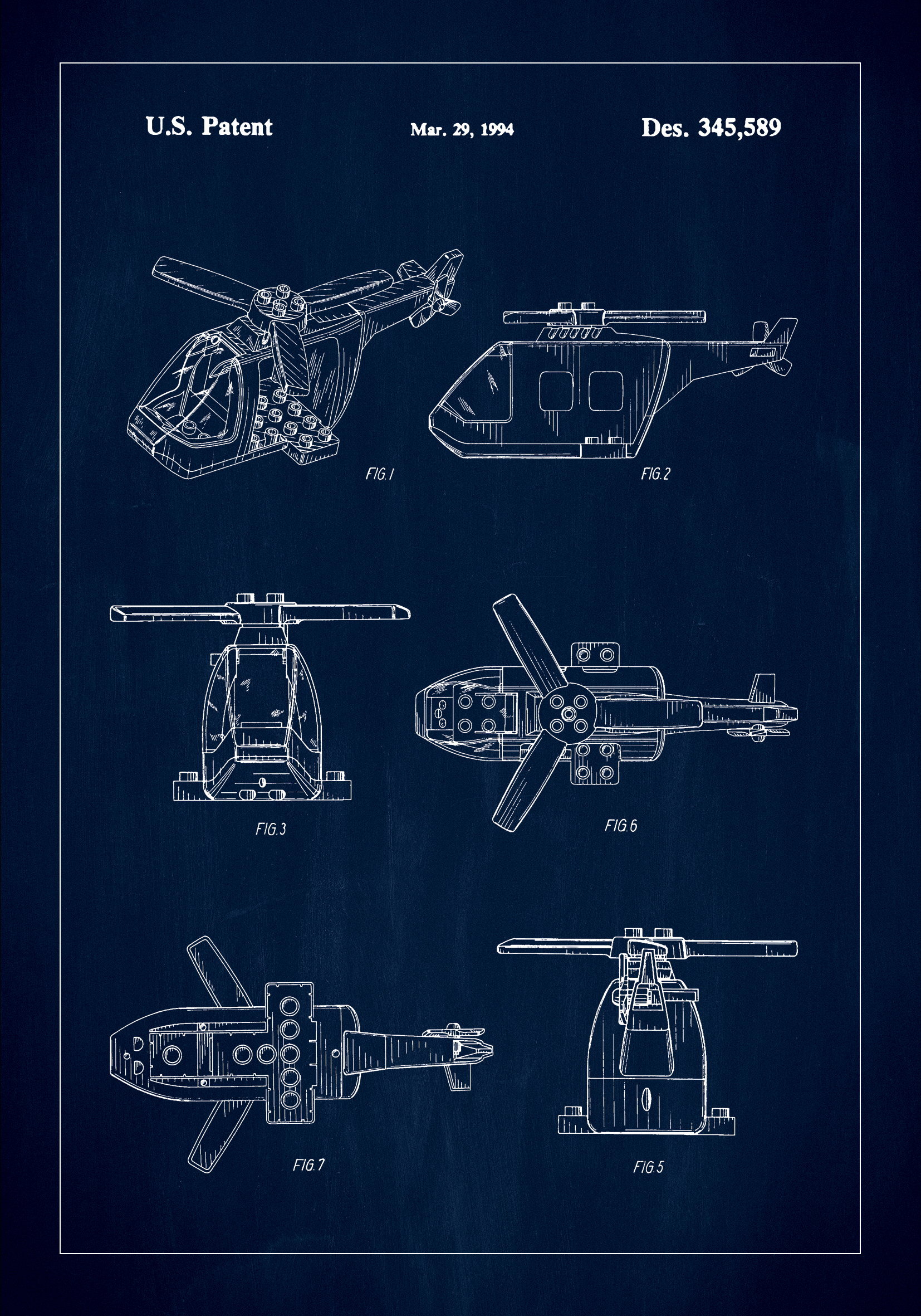 Tento exkluzivní patentový plakát zobrazuje estetické a funkční mistrovské dílo vrtulníku z Lega podle amerického patentu Des. 345,589, datovaného 29. března 1994. S temně modrou námořnickou barvou, která krásně kontrastuje s bílými čarami, tato patentová kresba zachycuje esenci pokročilého inženýrství a designu. Je poctou inovaci a je ideální pro ty, kteří oceňují technickou jemnost a historicky vlivný design ve svém interiérovém výběru.