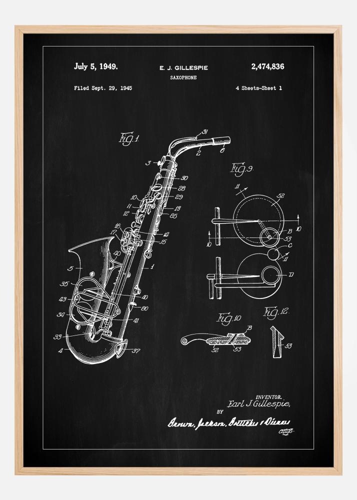 Černé pozadí poskytuje odvážný a moderní kontrast, který zvýrazňuje bílé linie a vytváří nápadný vizuální efekt, který přitahuje pozornost diváka. Pro jazzové nadšence, hudební historiky a milovníky designu nabízí tento patentní nákres uměleckou a historickou perspektivu na jeden z nejikoničtějších hudebních nástrojů všech dob. Patentní plakát jako tento je více než jen interiérový doplněk; je to pocta inovaci a hudebnímu vyjádření, které saxofon reprezentuje.