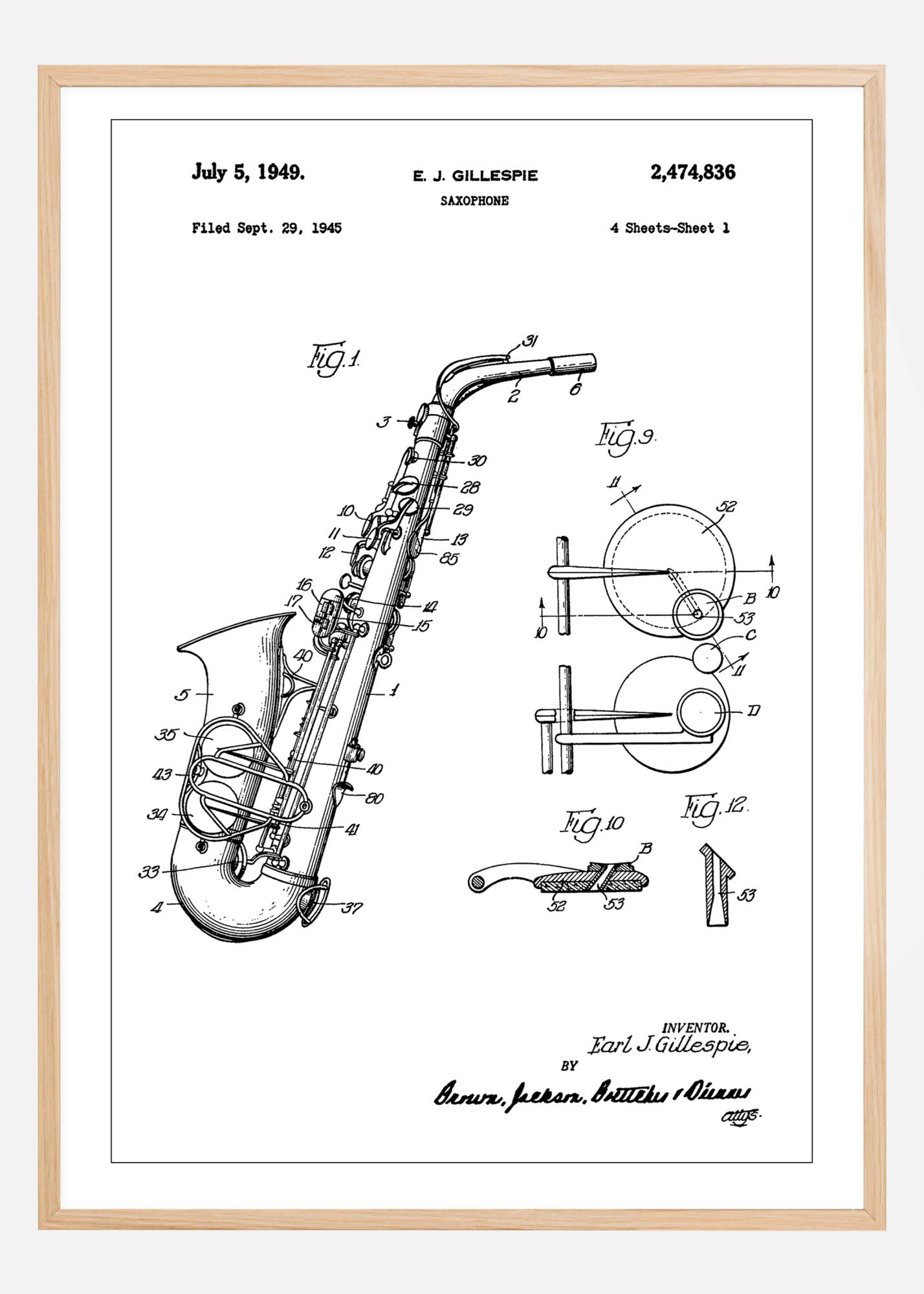 Tento pečlivě detailně zpracovaný patentový dokument představuje patentový výkres saxofonu, datovaný 5. července 1949. Je to mimořádný příklad technické konstrukce a designu hudebního nástroje, zdůrazněný jasnými liniemi a přesnými značkami patentu. Pro milovníky hudby, výrobce nástrojů a znalce vzácných diagramů je tento patentový plakát stylovou poctou kreativnímu procesu za výrobou saxofonu.
