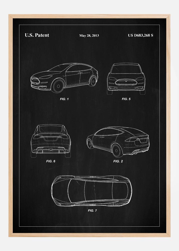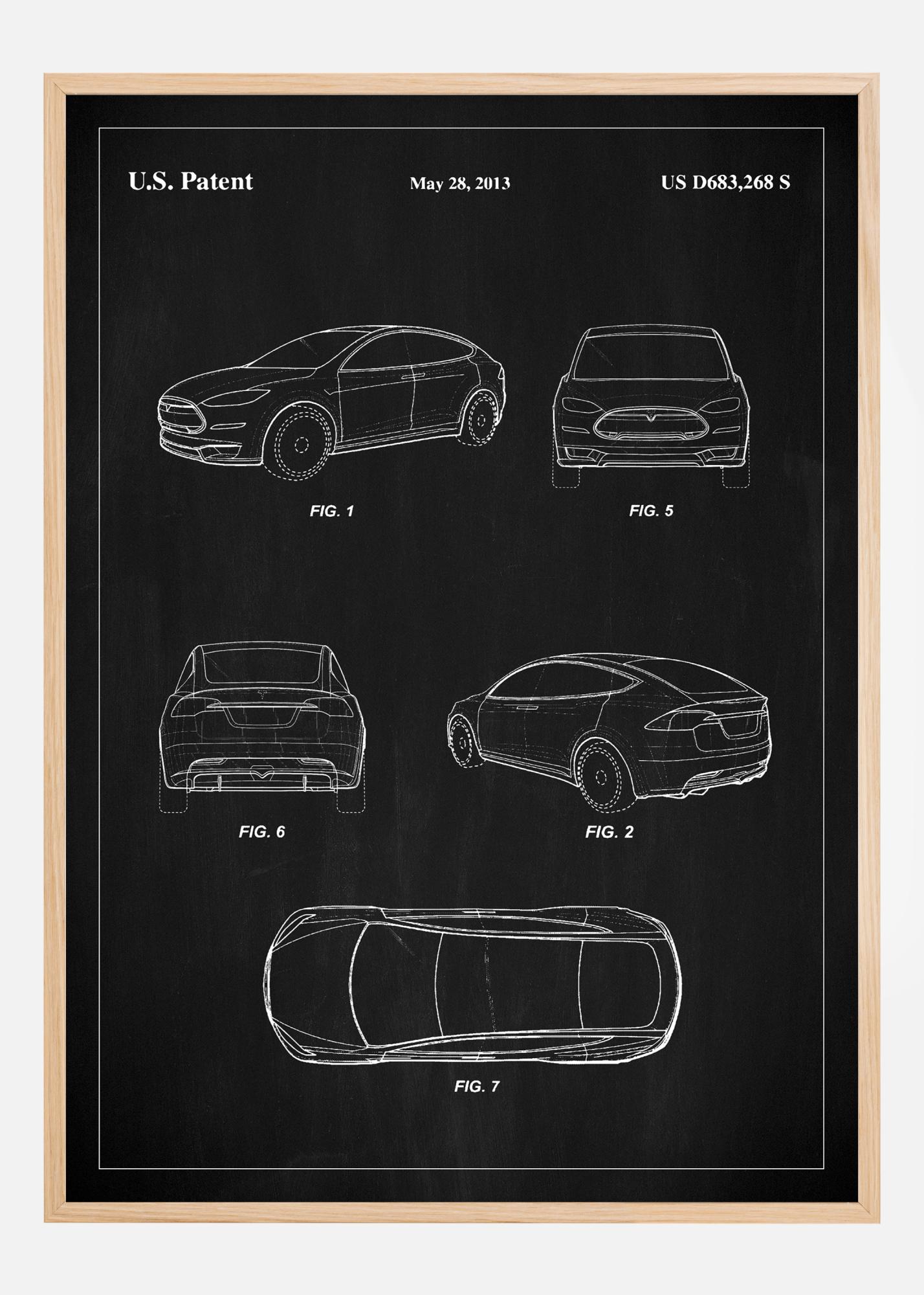 Tento elegantní a sofistikovaný patentový plakát je poctou modernímu automobilovému designu Tesly, který byl dokumentován v americkém patentu s číslem US D683,268 S dne 28. května 2013. Plakát zobrazuje výraznou sochu vozidla, která definuje špičku v automobilové výrobě. Každá linie a křivka jsou pečlivě nakresleny bílou barvou na černé tabuli, což vytváří velkolepý kontrast, který zachytí a udrží pozornost pozorovatele.