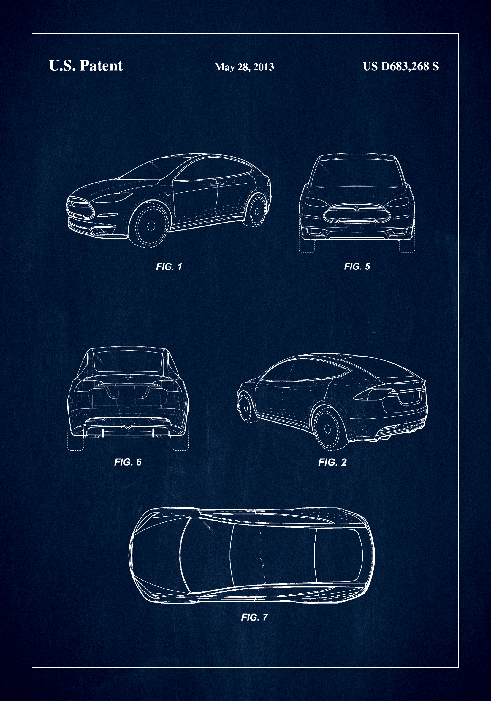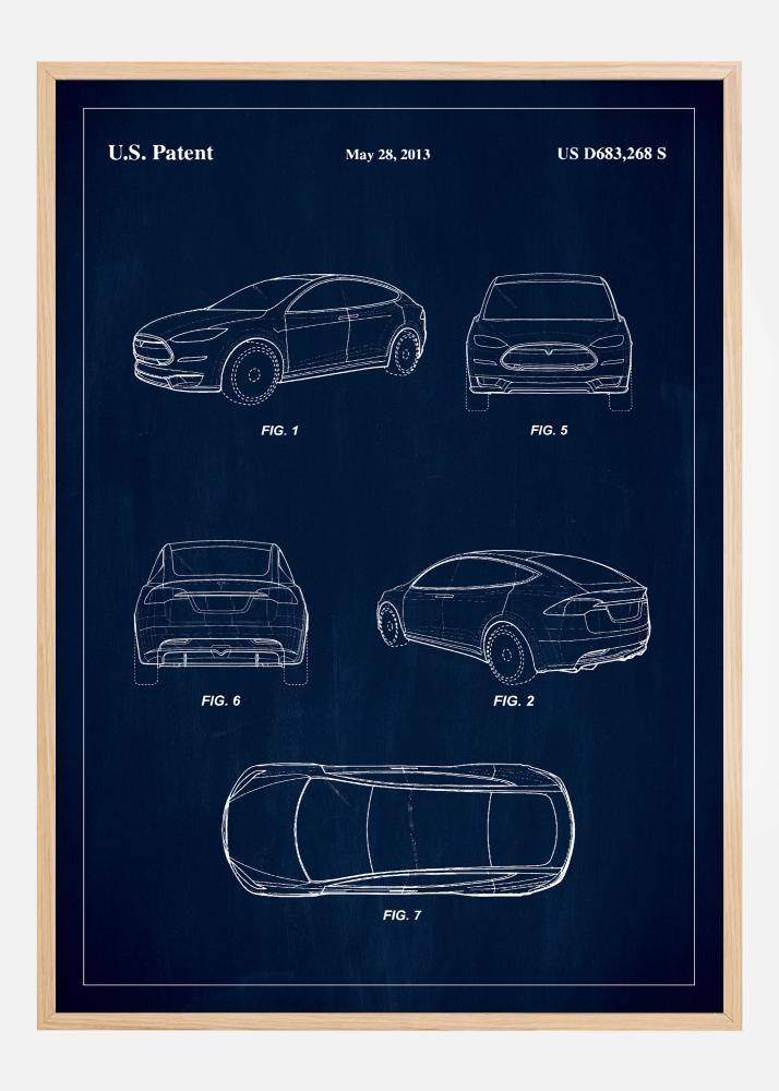 Hrdě představujeme tento patentový plakát, grafické zobrazení US D683,268 S, udělené 28. května 2013, zachycující design vozidla Tesla, který je stejně inovativní jako esteticky atraktivní. Plakát je ideálním doplňkem pro každý sběratelský domov nebo pracoviště a nabízí jedinečný pohled na designový proces jednoho z nejvýznamnějších tvarů v automobilovém průmyslu.