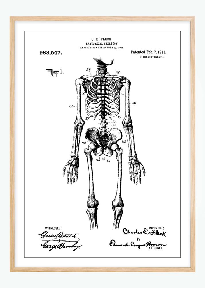Tento poučný a detailně propracovaný patentový plakát představuje anatomický model kostry, ilustrovaný v patentu s číslem 983,547. Patent byl udělen 7. února 1911 C. E. Fleckovi a je zajímavým příkladem rané lékařské pedagogiky a designu. FIG. 1 zobrazuje kostru v plné figuře, což poskytuje jasný přehled o struktuře těla a umístění kostí.