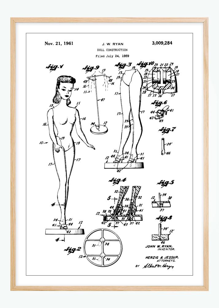 Tento výrazný patentový plakát odhaluje konstrukci panenky Barbie, jejíž patent byl udělen 21. listopadu 1961 pod číslem 3,009,284. Vynalezený J.W. Ryanem a podaný 24. července 1959, ukazuje výkres unikátní části a spojení panenky, fascinující příklad návrhu a inovace hraček z poloviny 20. století. Plakát je prvotřídní konverzační kousek, který je ideální pro sběratele nebo jako hravý dekorativní prvek v kreativním prostoru.