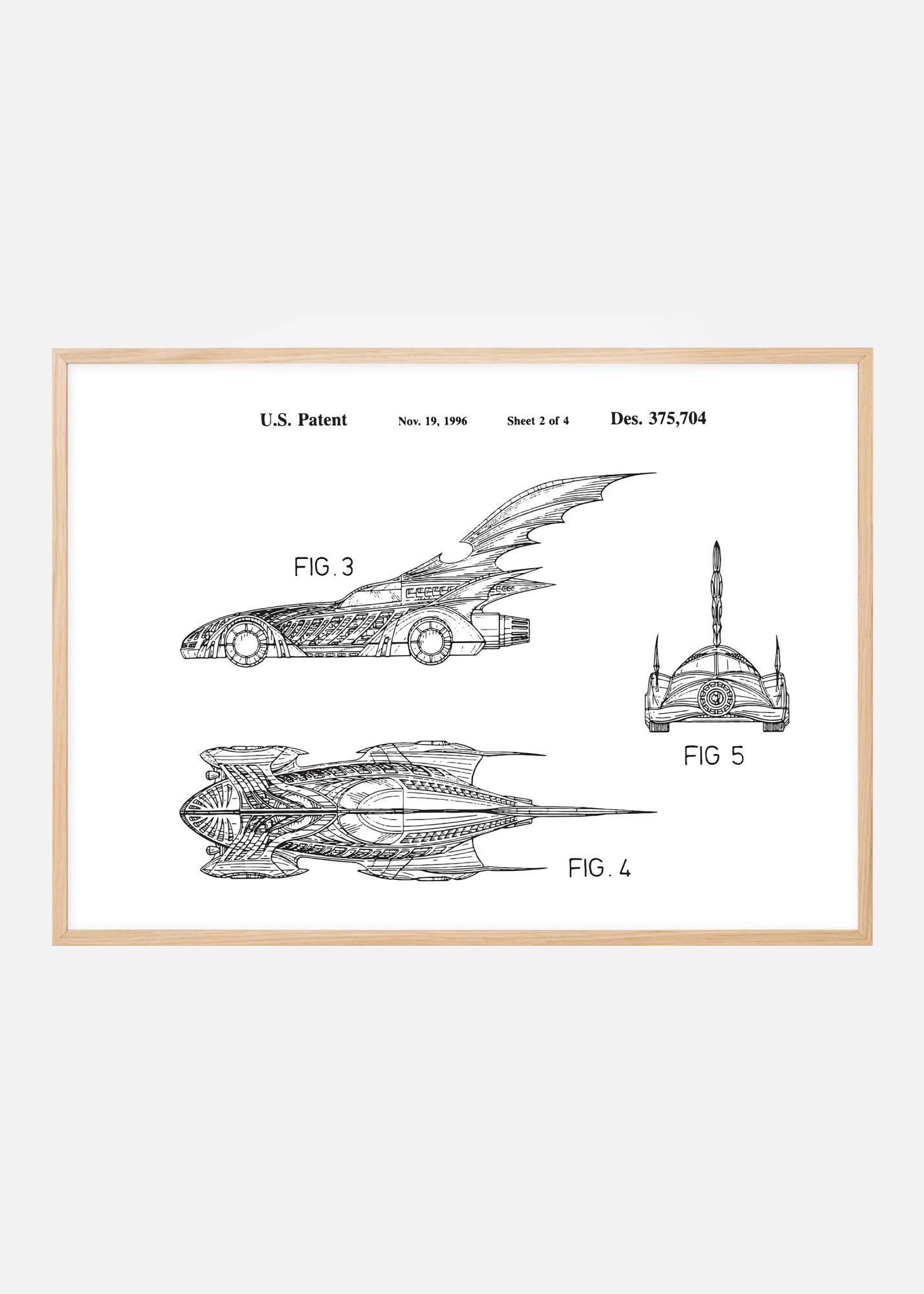 Tento jedinečný patentový plakát ukazuje nádherné skici z amerického patentu Des. 375,704, datovaného 19. listopadu 1996. Tento umělecký patentový nákres přináší kreativní atmosféru do jakéhokoli prostoru s vyobrazeními konceptuálního vozidla, které je stejně tak uměleckým dílem jako technickým zázrakem. FIG. 3 a FIG. 4 zobrazují Batmobil v profilu a přehledu, čímž divákovi poskytují pocit jeho inovativního tvaru a struktury, zatímco FIG. 5 se zaměřuje na charakteristický zadní konec a jeho jedinečné vlastnosti.
