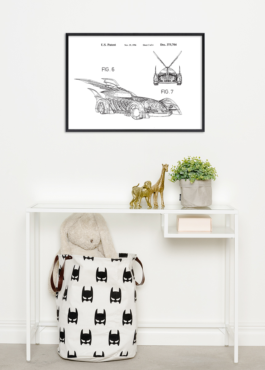 S odvážným a fantazijně vzbuzujícím motivem nabízí tento patentový plakát exkluzivní pohled do designového procesu za mimořádným vozidlem. Dokumentované v americkém patentu Des. 375,704, vydaném dne 19. listopadu 1996, FIG. 6 a FIG. 7 ukazují dva různé pohledy na Batmobil, který vyniká svou aerodynamickou siluetou a dramatickým designem. Detaily v tomto patentovém výkresu, od zametajících linií po velká, zdobená křídla, z něj činí neodolatelný dekorační prvek pro sběratele a nadšence designu.