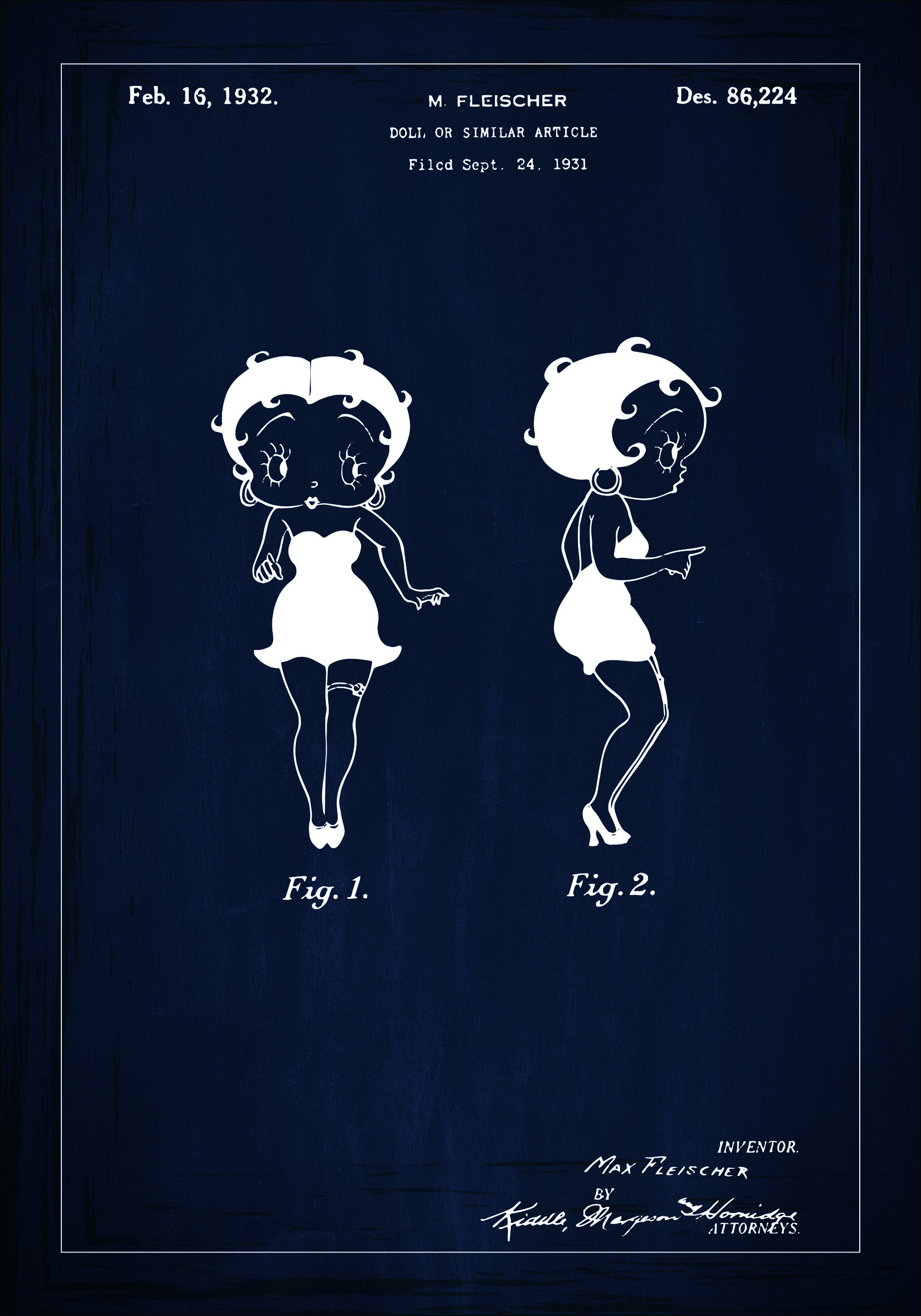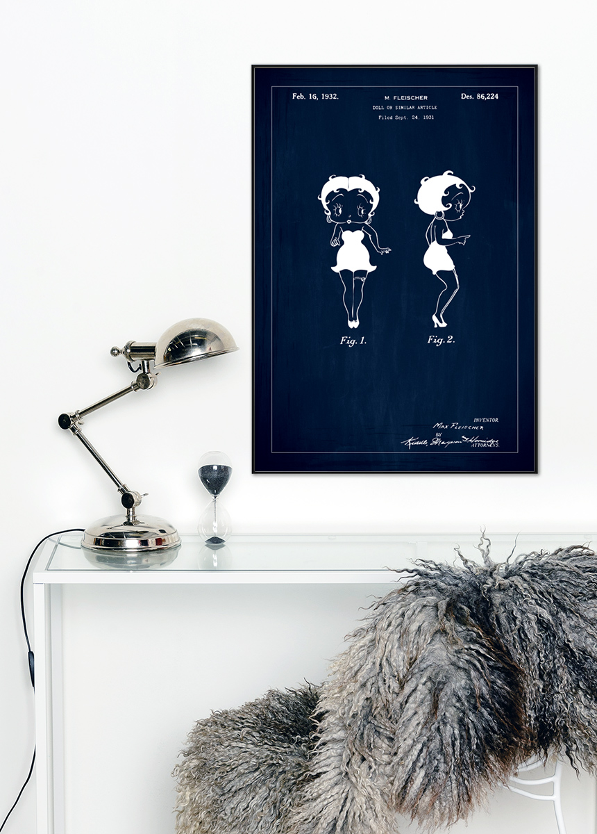 Tento patentový plakát ze dne 16. února 1932 zobrazuje panenku Betty Boop, navrženou M. Fleischerem. Patentové číslo je Des. 86,224 a žádost byla podána 24. září 1931. Na této ilustraci vidíme dvě figury panenky; jednu zepředu a jednu z boku, které zobrazují charakteristické vlastnosti a tvar panenky.