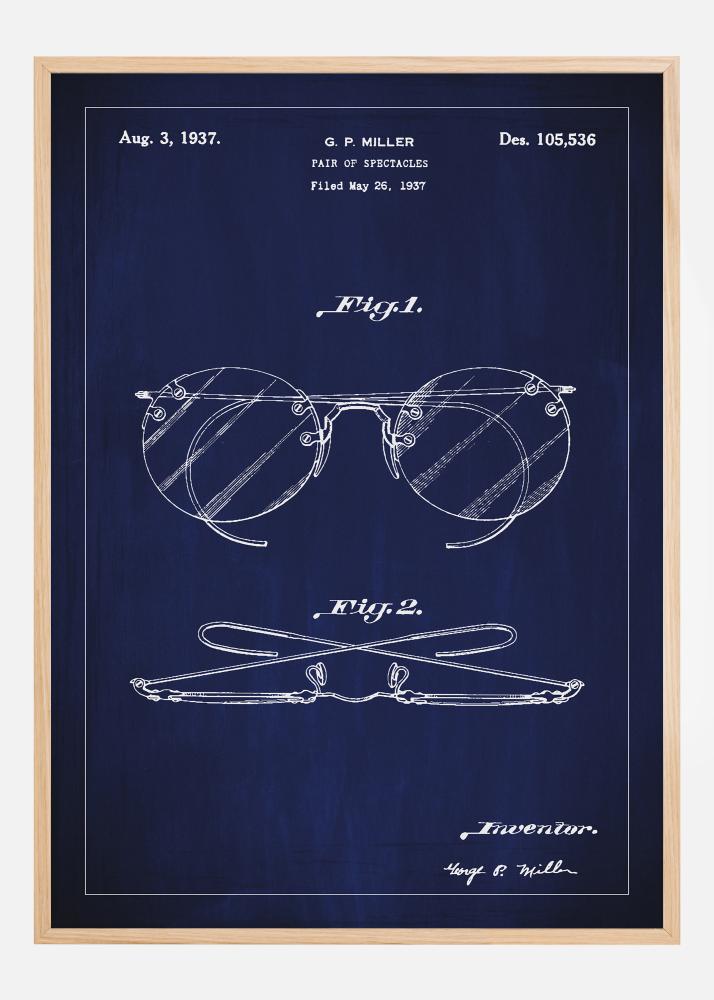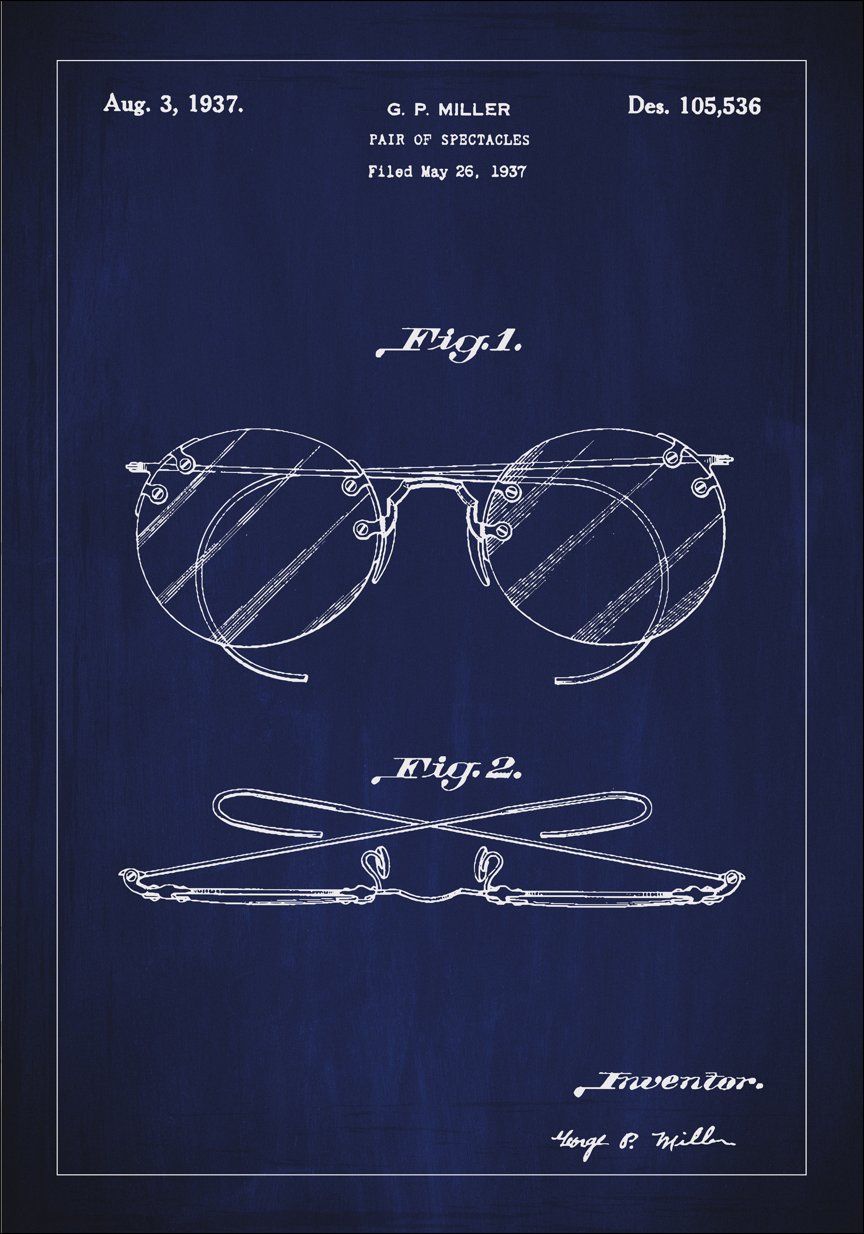 Tento patentový plakát poskytuje elegantní vyobrazení návrhu brýlí od G. P. Millera, dokumentovaného designovým patentem číslo 105,536, který byl vydán 3. srpna 1937. Promyšlené linie a jasné zpracování zachycují klasický styl a funkčnost tohoto každodenního předmětu. Tento specifický návrh brýlí reprezentuje časovou epochu v oblasti optiky a designu, což dělá z této patentové kresby jedinečnou a sofistikovanou nástěnnou dekoraci.