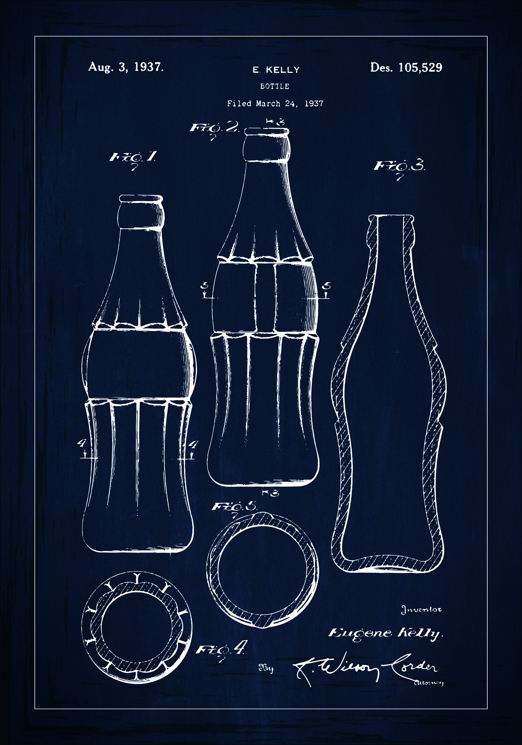 Tento patentový plakát ilustruje designový patent na láhev CocaCola, který byl udělen 3. srpna 1937 pod patentovým číslem Des. 105,529. Vynálezce Eugene Kelly stál za tímto klasickým designovým patentem, který byl podán 24. března 1937. Výkresy ukazují tvar láhve z různých perspektiv, včetně přední strany, skupiny v naskládané poloze, profilu a dvou průřezových pohledů. Detaily a proporce zdůrazňují výrazné a rozeznatelné obrysy, které se staly ikonickými po celém světě.