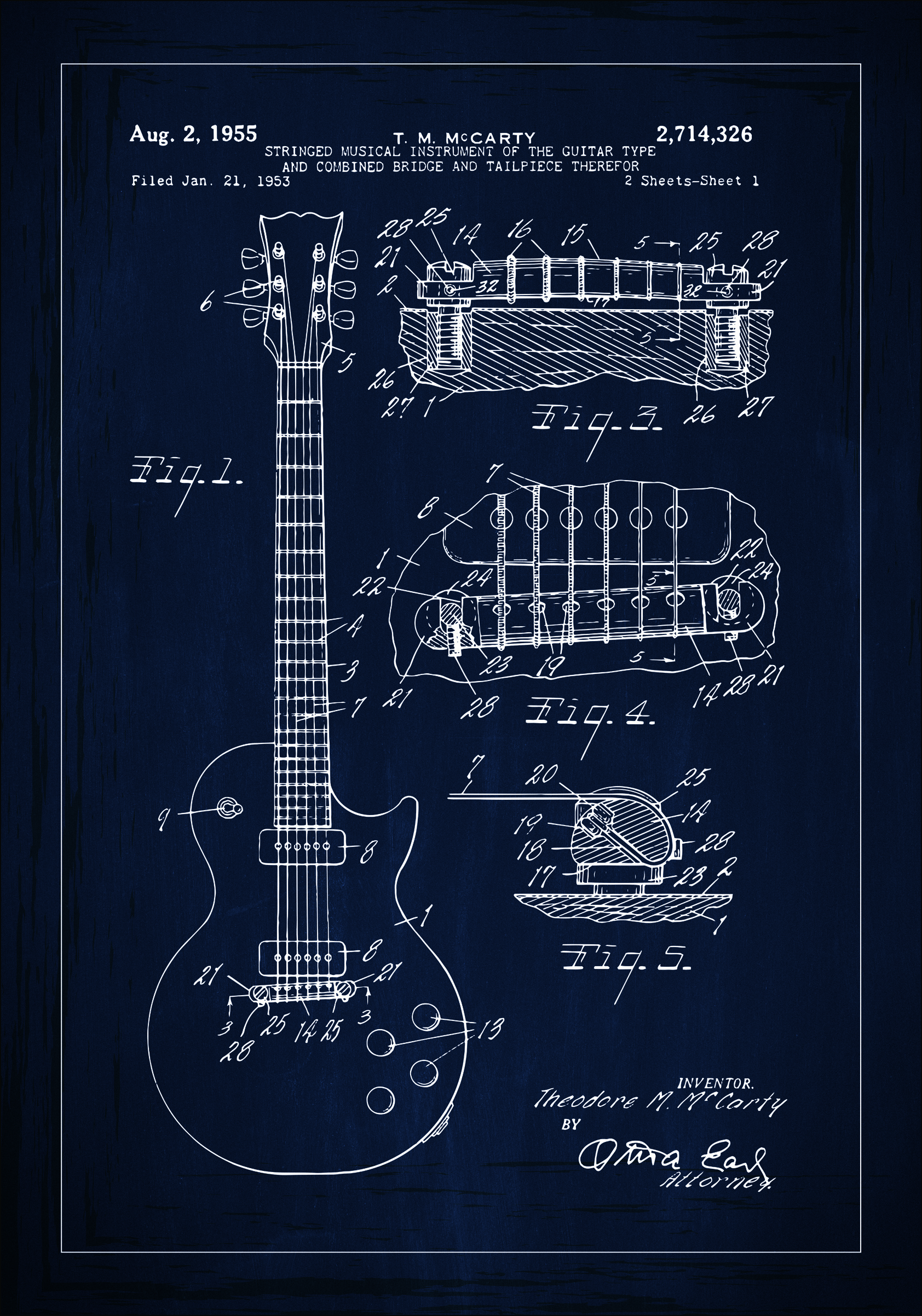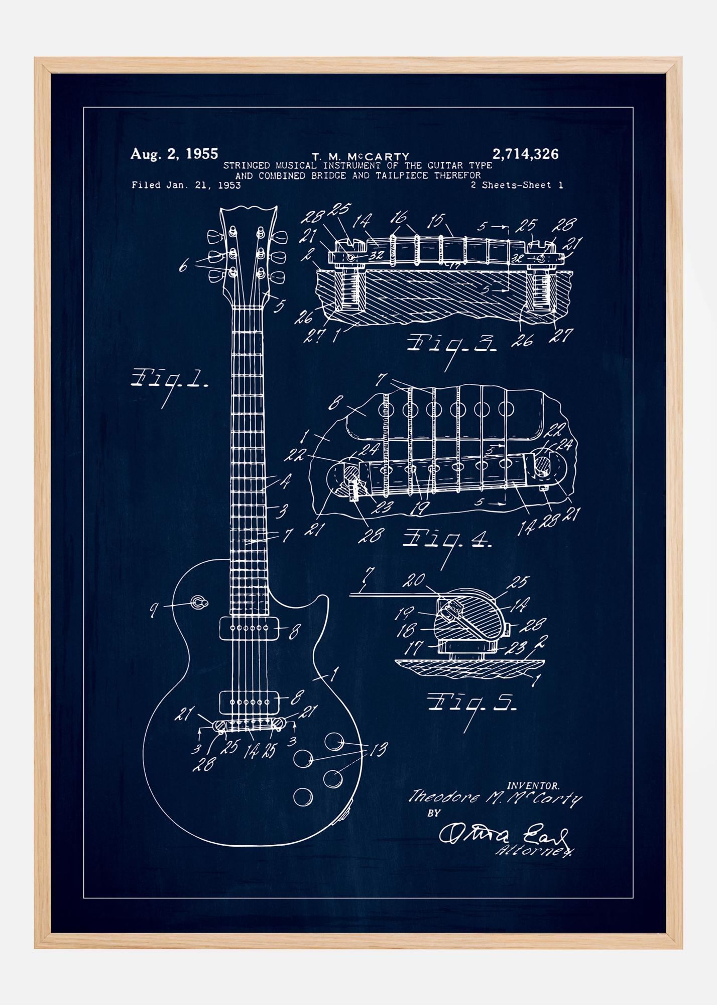 Tento patentový plakát zobrazuje podrobný a přesný nákres strunného hudebního nástroje z 2. srpna 1955, s patentovým číslem 2,714,326. Patent pro tento nástroj, který by mnoho lidí rozpoznalo jako elektrickou kytaru, byl zaregistrován Theodorem M. McCartym 21. ledna 1953. Plakát zobrazuje nástroj v elegantním celkovém pohledu i v technicky pokročilých detailních pohledech, což zdůrazňuje inovativní design a kombinovanou kobylku jako část jeho unikátních vlastností.
