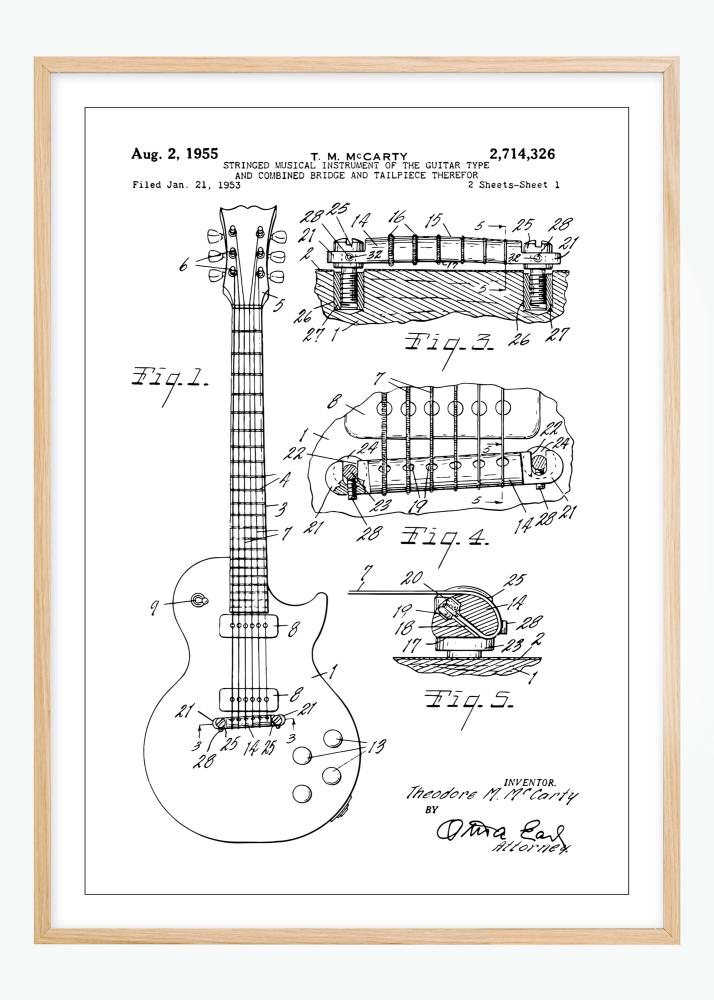 Tento patentový plakát zobrazuje detailní výkres strunného hudebního nástroje, konkrétně kytary, který byl dokumentován vynálezcem Theodorem M. McCartym dne 2. srpna 1955 pod patentovým číslem 2,714,326. Výkres znázorňuje konstrukci nástroje s kombinovaným můstkem a struníkem, což je inovativní design, který přispěl k tónu a hratelnosti kytary. Různé pohledy poskytují náhled do mechanických a estetických aspektů konstrukce kytary.