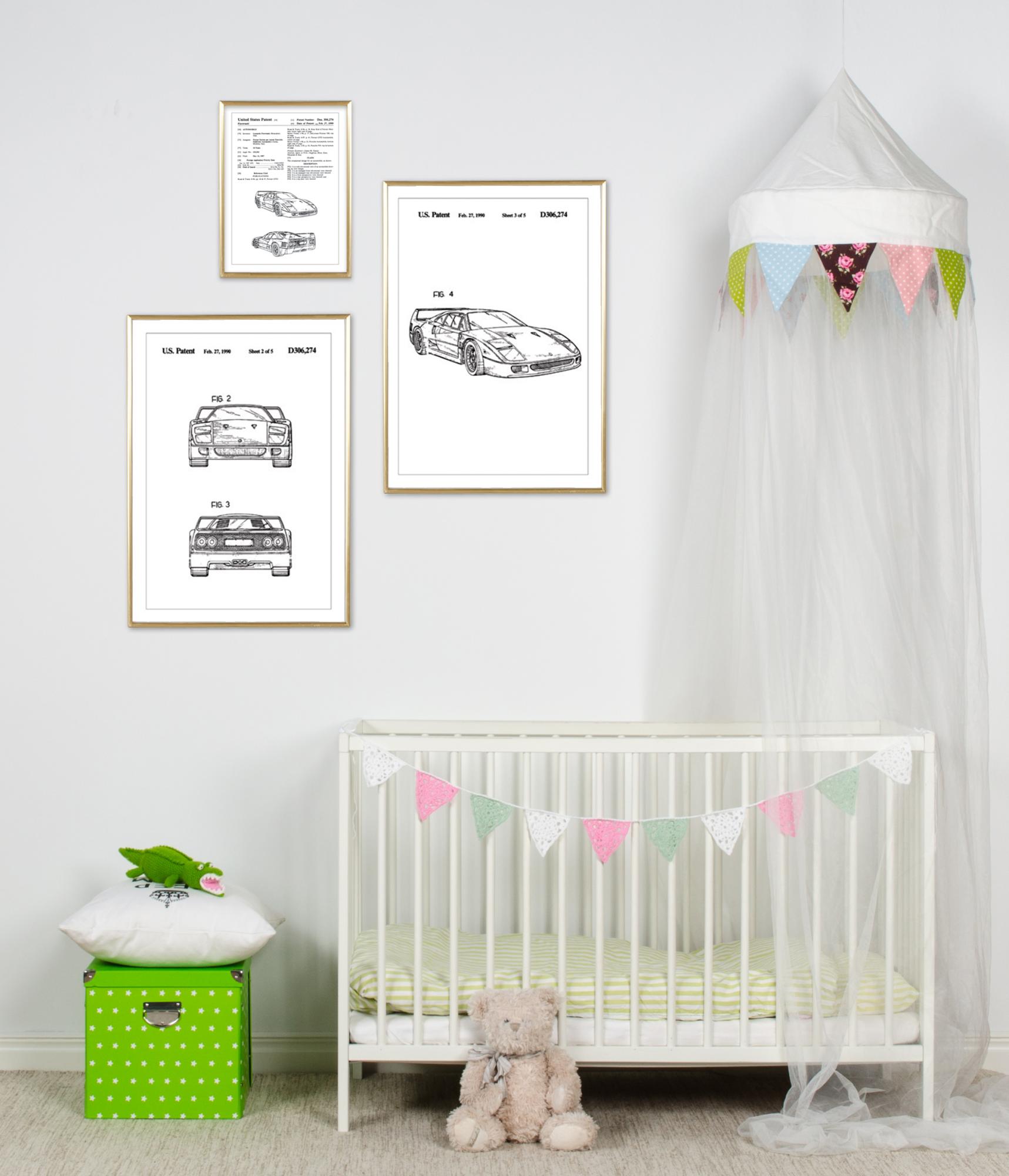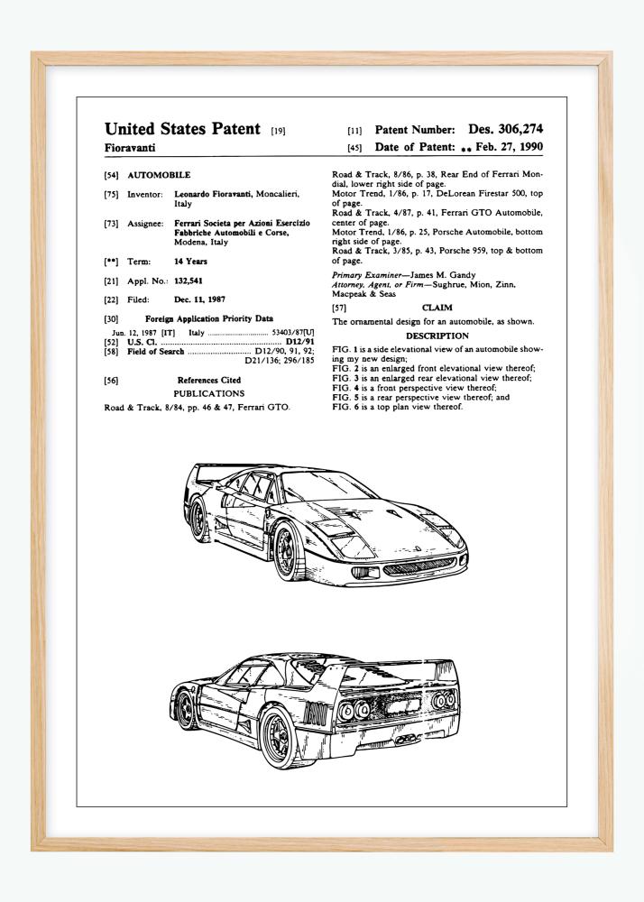 Tento elegantní patentový plakát zobrazuje návrh auta od Leonarda Fioravantiho pro Ferrari, jednoho z nejikoničtějších jmen v automobilovém průmyslu. Uděleno 27. února 1990 pod patentovým číslem Des. 306,274, dokument reprezentuje estetický design Ferrari F40, jež zachycuje podstatu rychlosti a inovace. Ilustrace patentu zdůrazňují výrazné linie a aerodynamickou siluetu, které definují tuto značku.