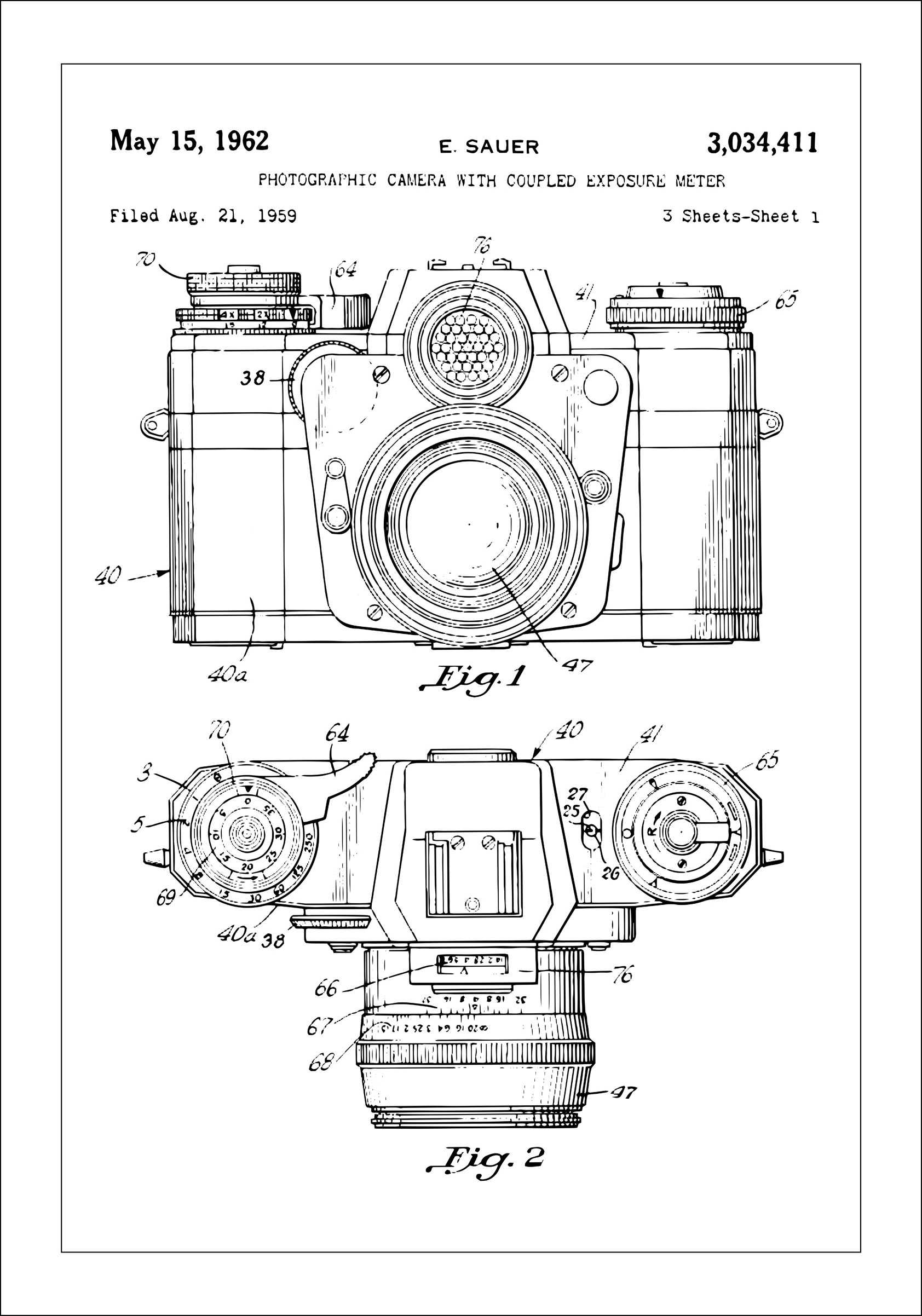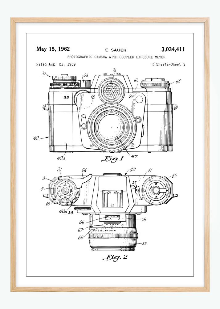 Patent s číslem 3,034,411 byl zaregistrován 21. srpna 1959 a vydán 15. května 1962 E. Sauerovi. Tento patentový plakát není jen poctou zlatému věku fotografie, ale také symbolem nadčasového designu a kreativity. Je to nápaditý umělecký kousek, který se hodí jak do minimalistických, tak industriálních interiérů, opravdový konverzační startér, který doplňuje každou místnost, kde je umístěn.
