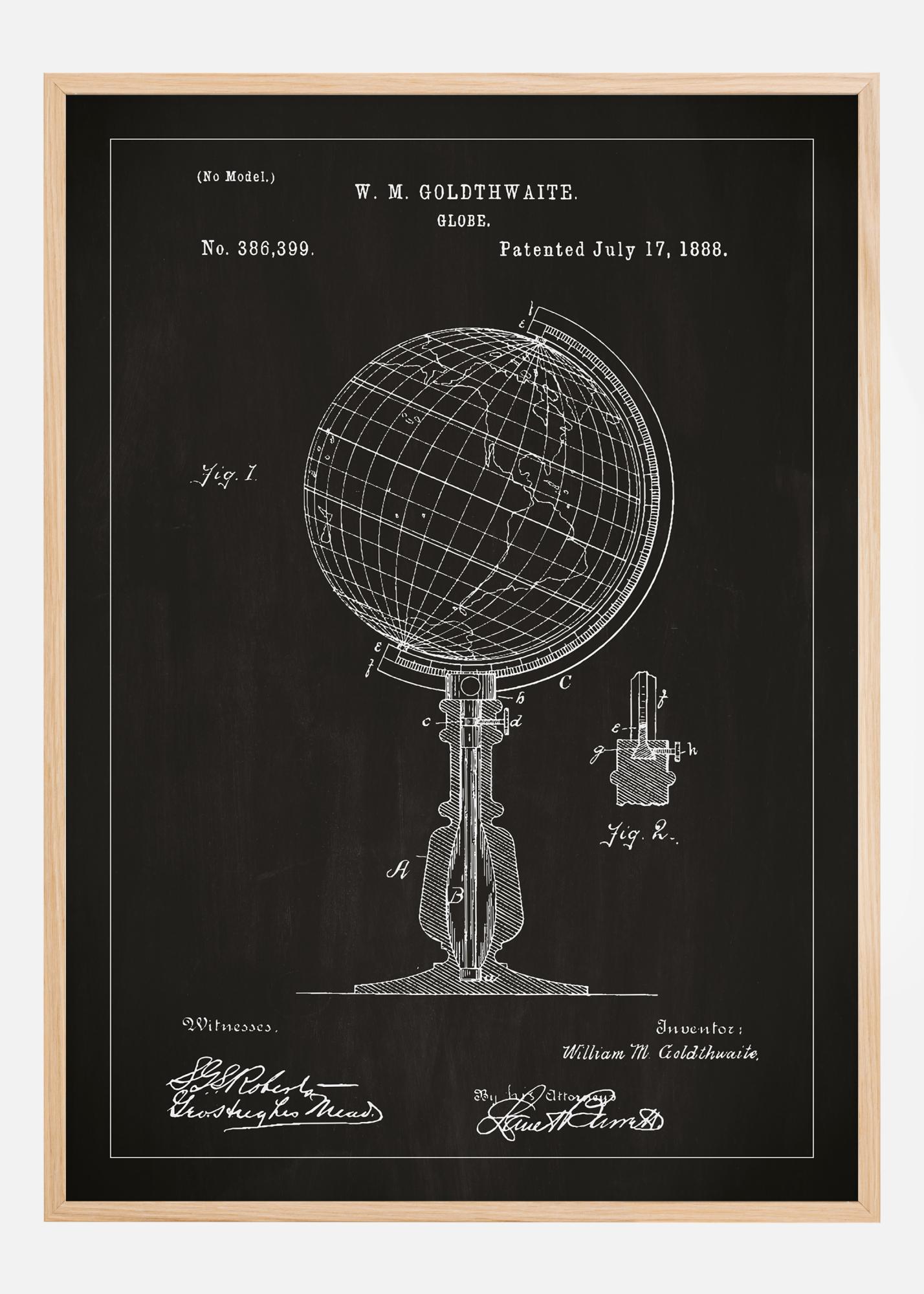 Tento patentní plakát zobrazuje návrh klasického glóbusu od W. M. Goldthwaite, detailně zpracované dílo, které bylo zvěčněno patentovým číslem 386,399 dne 17. července 1888. Plakát zachycuje eleganci a funkční krásu vynálezu, zobrazuje svět ve dvou rozměrech takovým způsobem, že inspiruje k objevování a průzkumu. Jeho přesné linie a jasnost designu z něj činí vynikající vzdělávací pomůcku a žádoucí dekoraci pro každého, kdo oceňuje geografii a světovou historii.