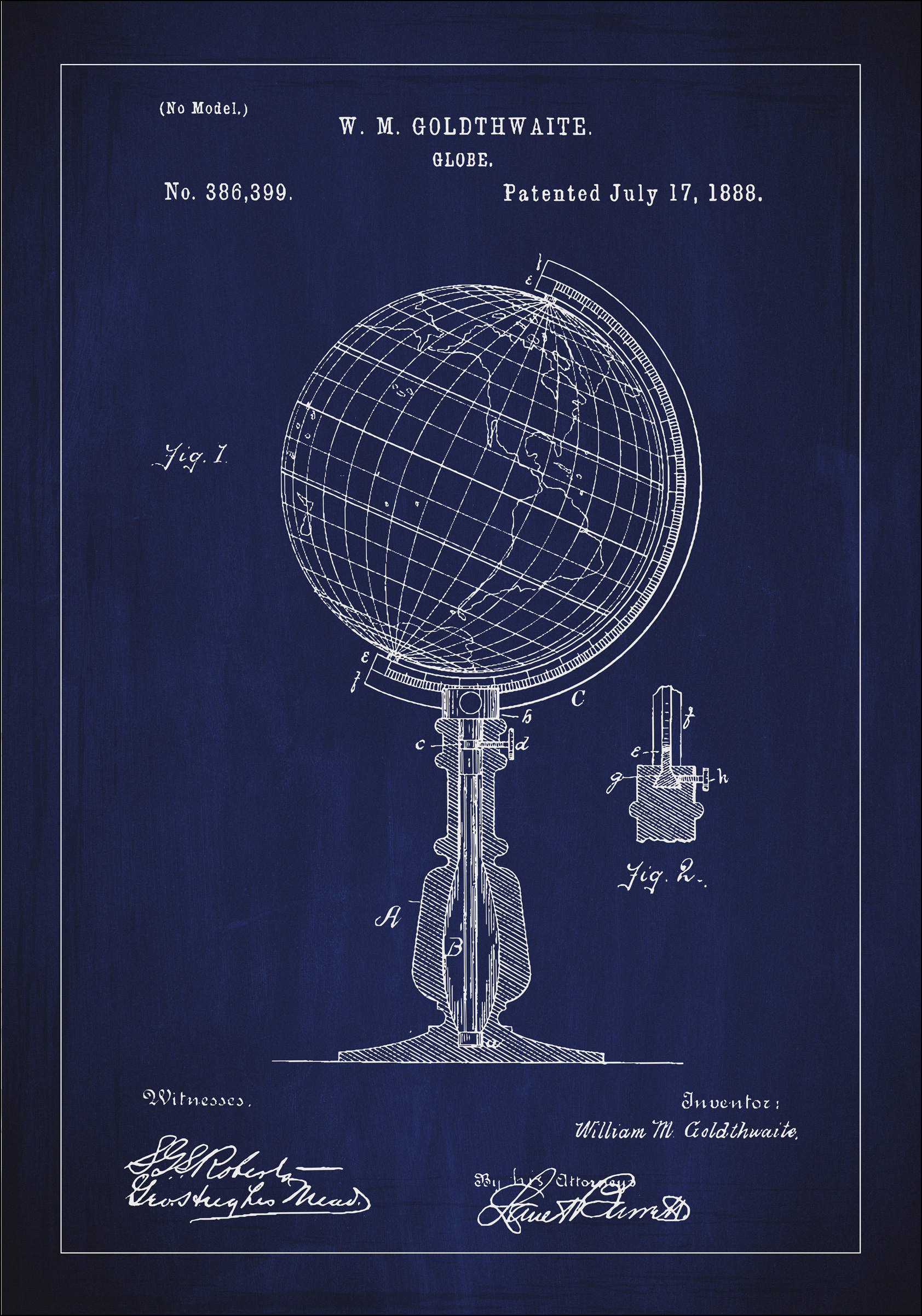 Vytvořte příjemné a intelektuálně podnětné prostředí s naším patentovaným plakátem zobrazujícím klasicky navržený globus W. M. Goldthwaitea, chráněný patentovým číslem 386,399 od 17. července 1888. Tento detailní patentový výkres zachycuje nejen technickou preciznost designu, ale i dobu, kdy se globální objevy a porozumění staly přístupnými širšímu publiku. Takové umělecké ztvárnění světa nabízí vzdělávací perspektivu a zároveň je elegantní dekorací.