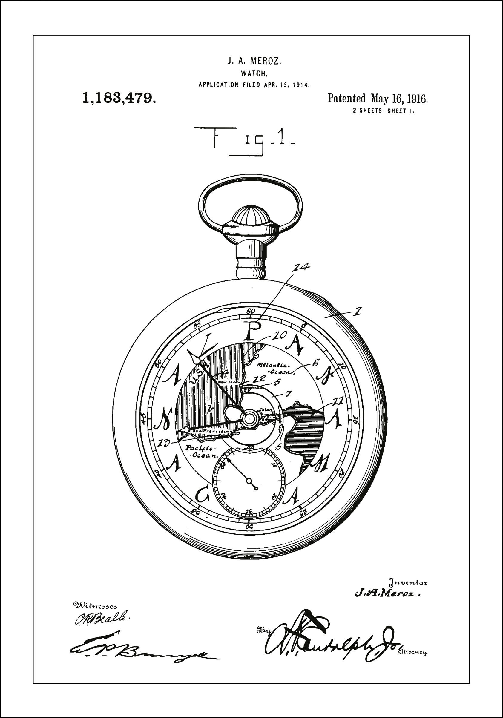 Toto je fascinující patentový plakát, který ukazuje detailní nákres návrhu hodin J.A. Meroze, patentovaný 16. května 1916 pod číslem 1 183 479. Patentový výkres detailně popisuje klasickou siluetu kapesních hodinek s charakteristickými prvky vnitřní mechaniky časoměřiče, což zdůrazňuje éru technické inovace a řemeslné dovednosti v umění hodinářství.