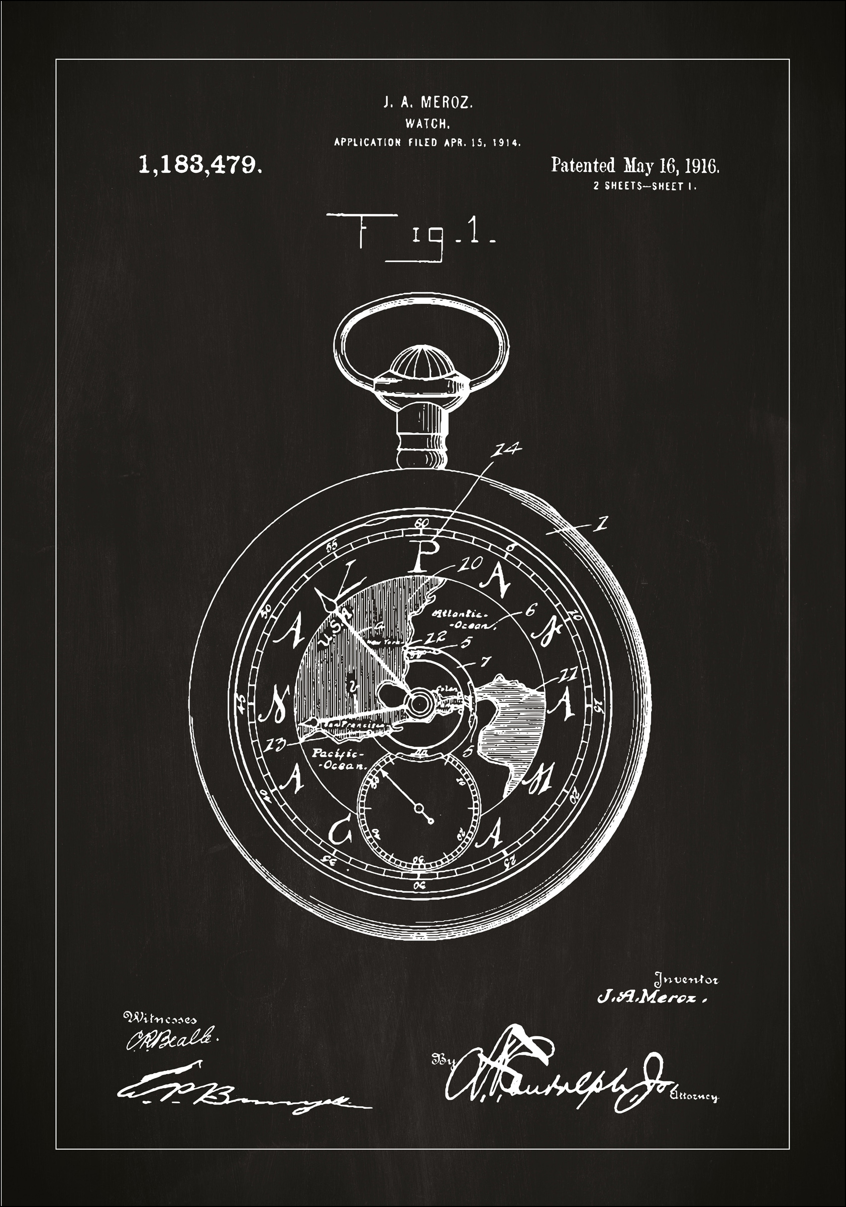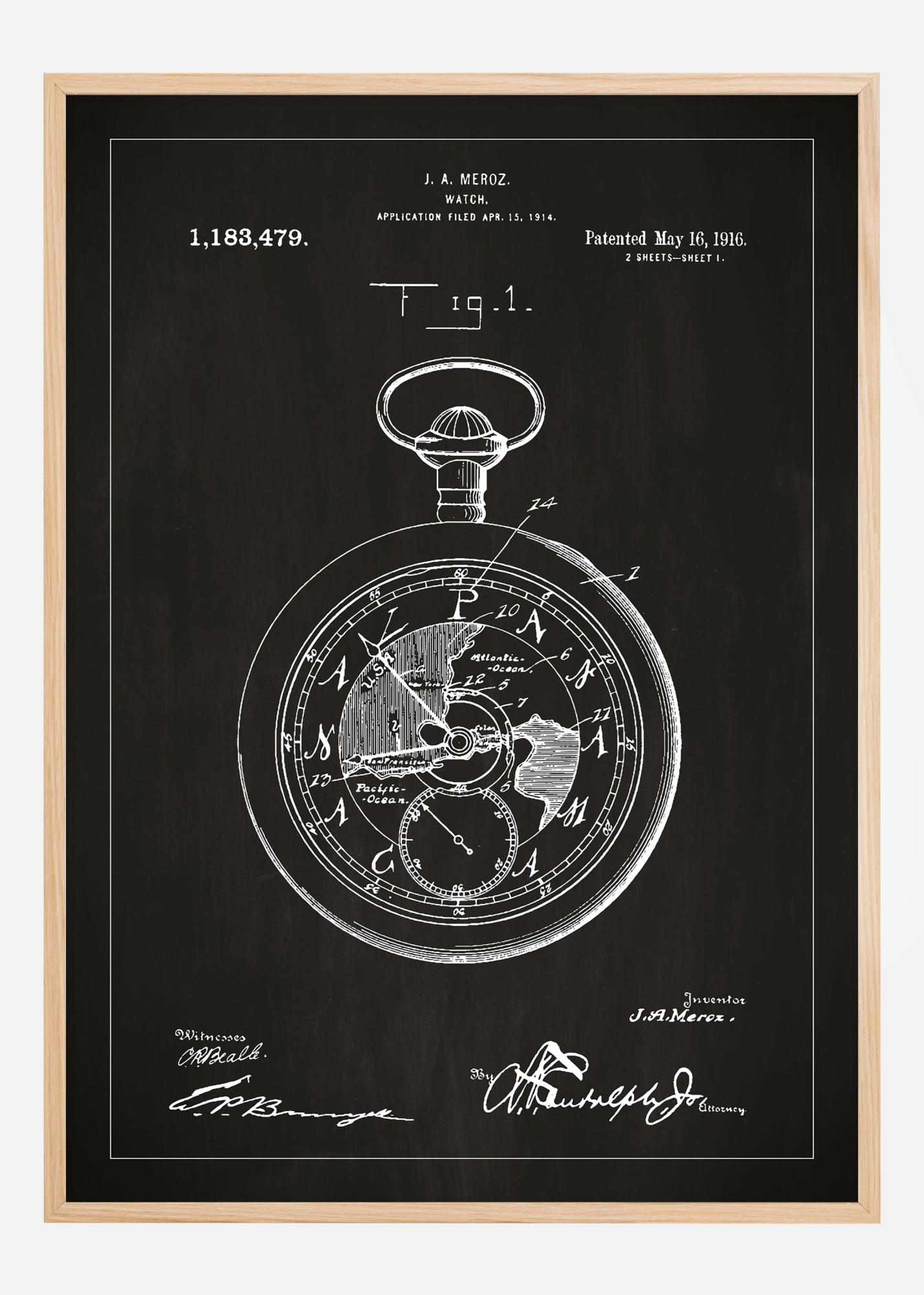 Tento sofistikovaný patentový plakát zobrazuje nadčasový vynález kapesních hodinek, patentovaný J.A. Merozem dne 16. května 1916, pod patentovým číslem 1,183,479. Detailní patentový výkres ukazuje složitý design hodinového stroje, kompletní s mechanickými detaily, které odrážejí éru, kdy se přesnost v měření času stala uměním sama o sobě.