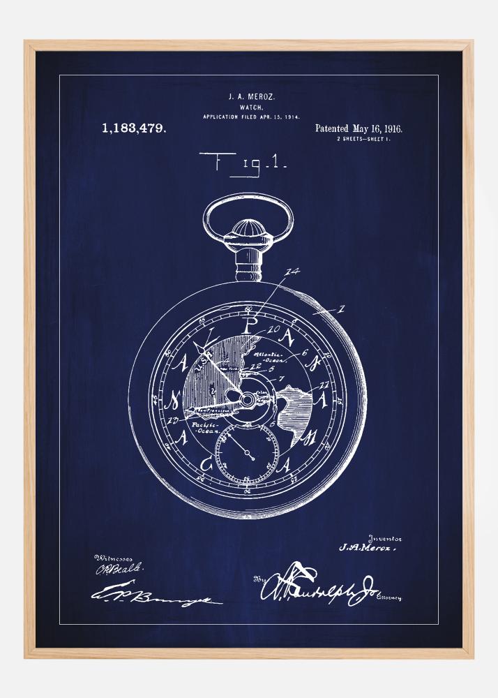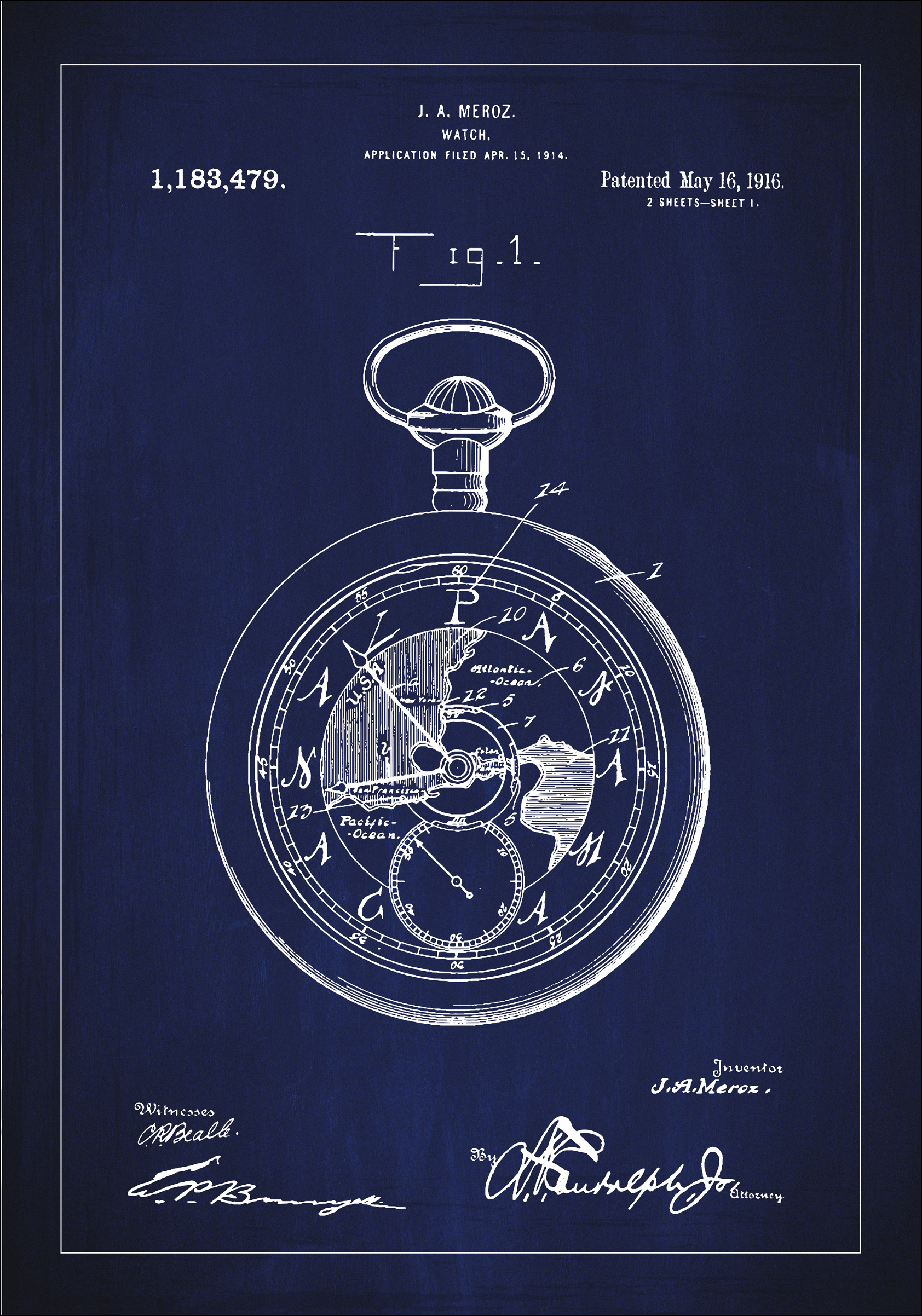 Svým výrazným vzhledem a technickou precizností není tento patentní nákres jen ozdobou na zeď, ale také poctou technickým pokrokům z počátku 20. století. Hodinky s propracovanými detaily a mechanickými komponenty jsou krásně zobrazeny na tmavém pozadí, což vytváří dramatický vizuální efekt. Tento patentní plakát představuje spojení umění a techniky, a je ideální volbou pro sběratele, nadšence a všechny, kdo ocení genialitu a industriální historii. Pozvedněte každý pokoj tímto nadčasovým zobrazením průlomového vynálezu.