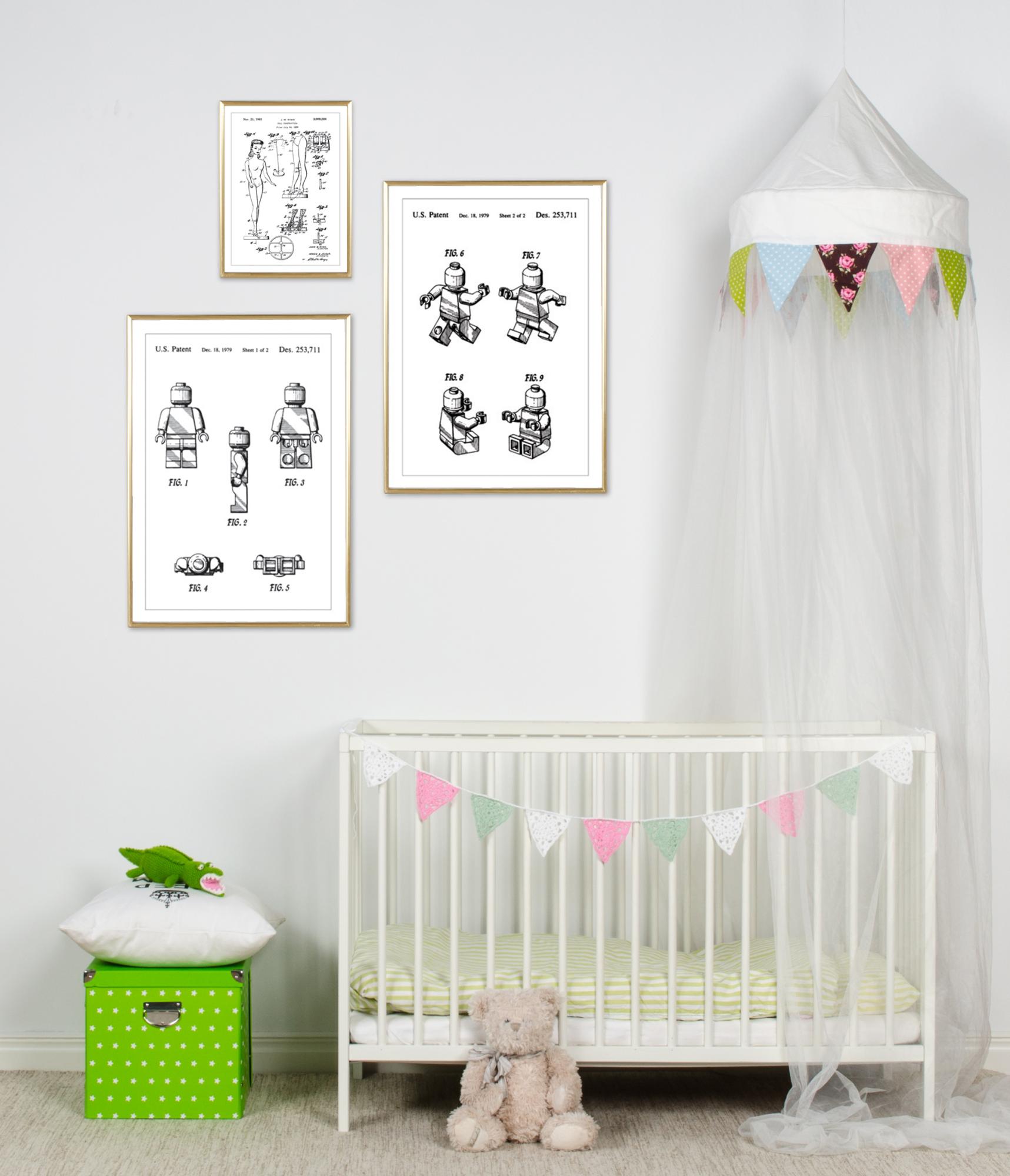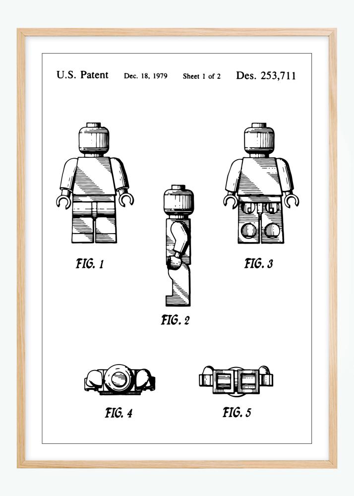 Tento patentový plakát představuje klasickou stavebnicovou Lego figurku, která je nadčasovou a kreativní hračkou, jež fascinovala představivost dětí po generace. Udělený 18. prosince 1979, pod patentovým číslem Des. 253,711, zobrazuje nákres stavební figurku v několika pohledech, které ukazují modulární design a flexibilitu hračky. Je to jednoduché, ale zároveň geniální zobrazení konceptu interaktivní a pedagogické hry.