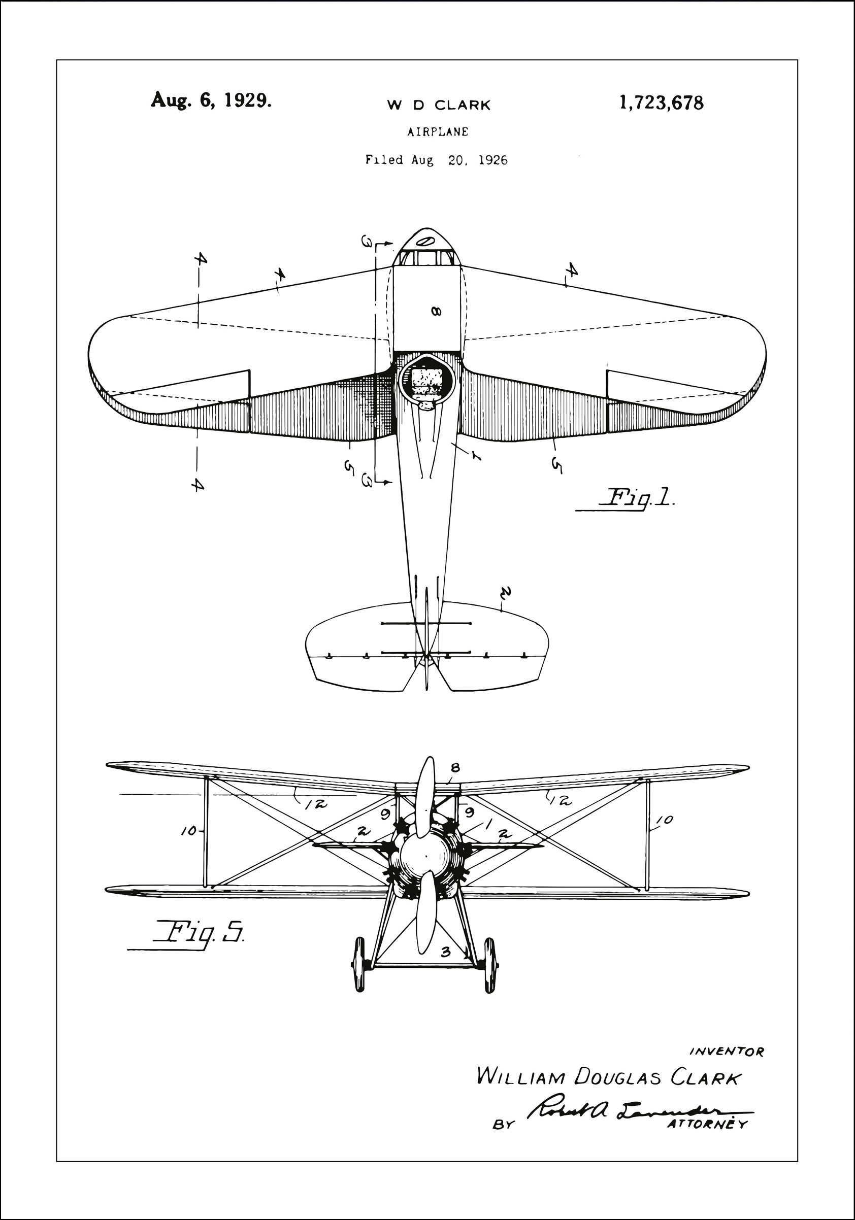 S klasickou jednoduchostí zachycuje tento patentní plakát konstrukci letadla W D Clarka, design, který ztělesňuje ducha raného letectví. Patent byl udělen 6. srpna 1929 pod číslem 1,723,678, a tato ilustrace je časovou kapslí inovace. Čisté linie a ostré detaily plakátu vzdávají hold technickému pokroku, který byl rozhodující pro budoucnost letectví.