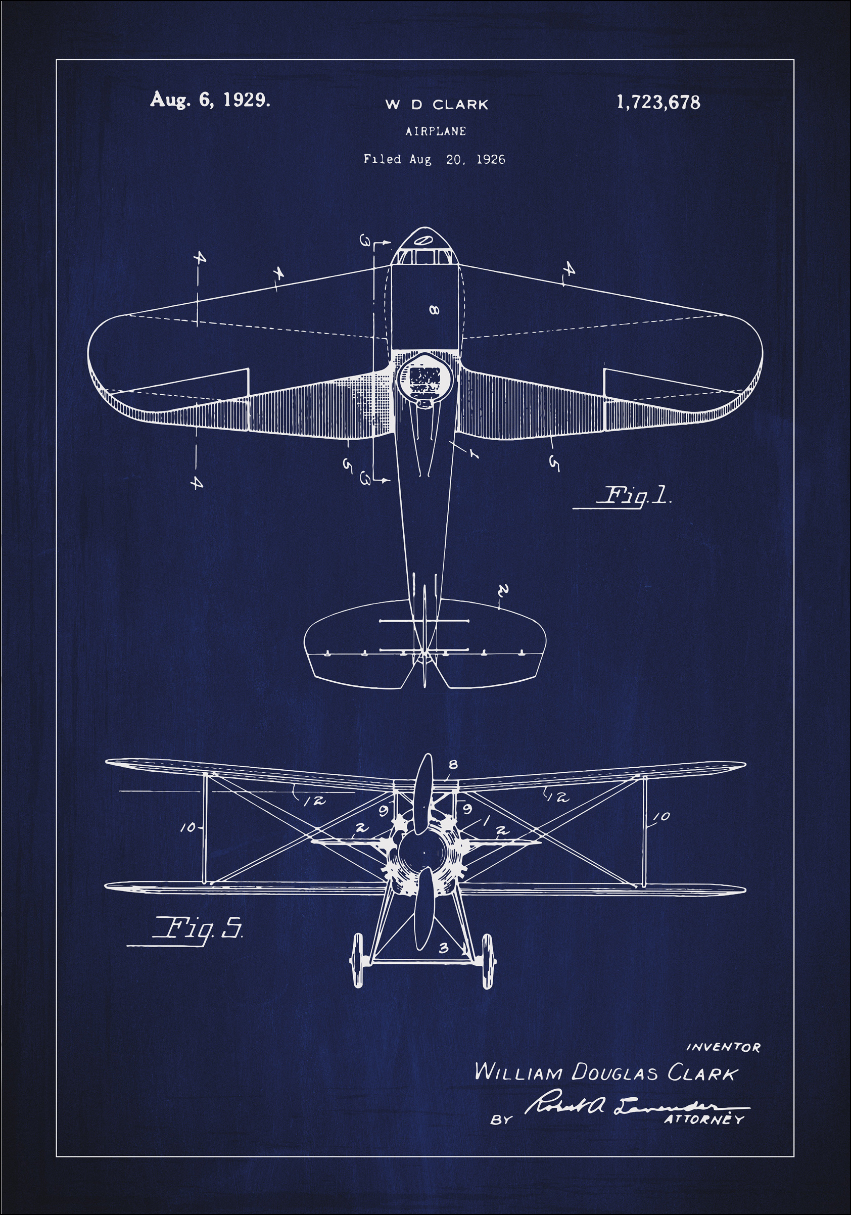 Vytvořte atmosféru letecké historie s tímto patentovým plakátem, který zobrazuje inovativní návrh letadla W D Clarka. Toto letadlo, které bylo patentováno 6. srpna 1929 pod číslem 1,723,678, je ikonou revoluční doby v letectví. Tmavé pozadí krásně kontrastuje s detailními bílými liniemi a vytváří elegantní a promyšlený dekorativní prvek.