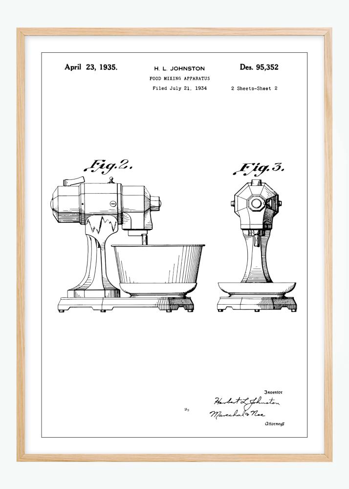Tento pečlivě zpracovaný patentový plakát zobrazuje přístroj na míchání potravin, nezbytný nástroj v kuchyni, který revolučně změnil umění vaření. Patent, navržený H.L. Johnstonem 23. dubna 1935, pod číslem Des. 95,352, ilustruje raný design stojacího mixéru, domácího spotřebiče, který se stal nepostradatelným v moderním vaření. Obrázek ukazuje zařízení ve dvou pohledech, což poskytuje komplexní porozumění jeho konstrukci a funkci.