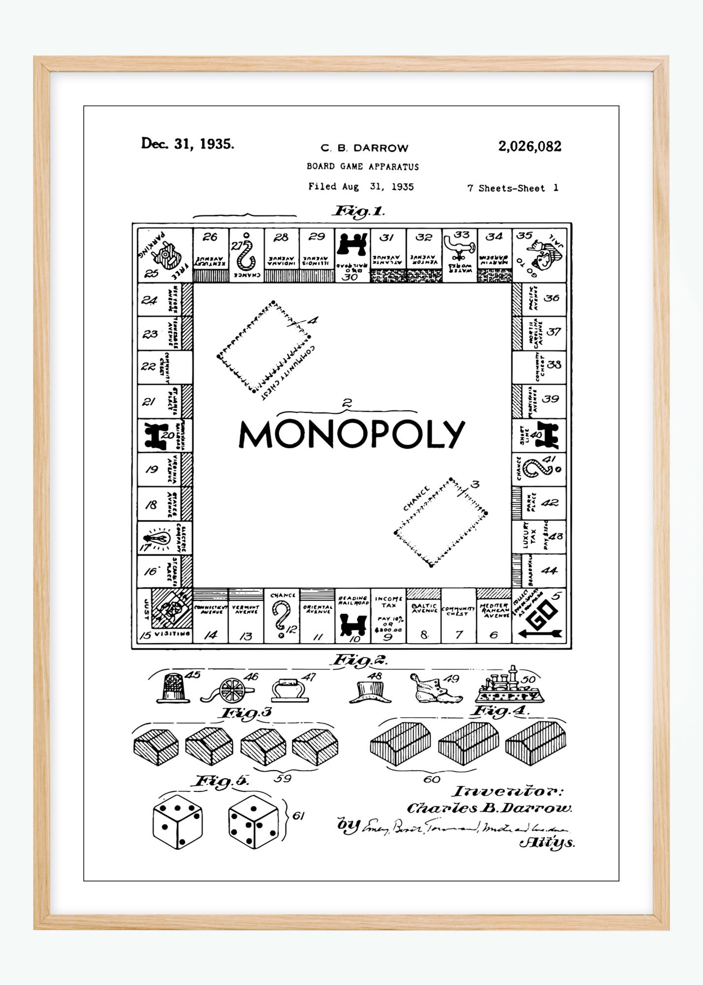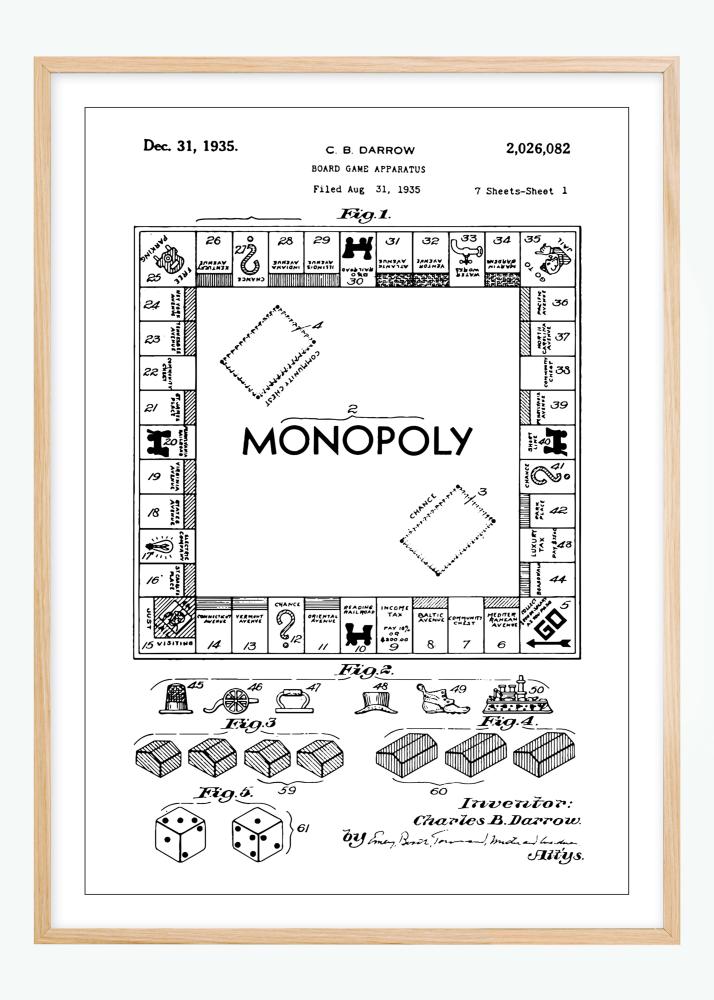 Tento patentový plakát zobrazuje klasický design oblíbené společenské hry Monopoly, kulturní ikony v rodinné zábavě a hrách. Data ukazují, že vynálezce Charles B. Darrow podal žádost o patent 31. srpna 1935 a byl mu udělen 31. prosince téhož roku s číslem 2,026,082. Podrobný nákres představuje přehled herní desky, kompletní s dobře známými poli "start", "šance" a "vlastnictví", stejně jako ikonickými herními figurkami a kostkami, což přináší nostalgický pocit a ocenění této nadčasové hry.