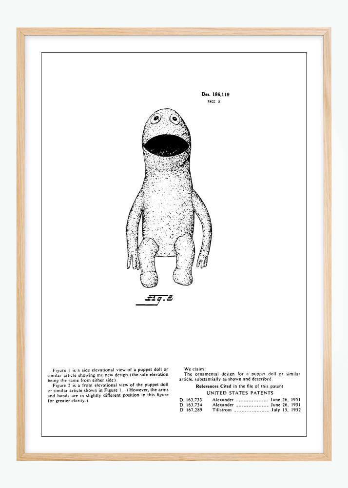 Tento patentový plakát zobrazuje hračku na Kermit. S patentovým číslem Des. 186,119 je tato ilustrace oficiálním dokumentem panenky s okouzlující a neobvyklou estetikou. Postava na kresbě nabízí úplný pohled zepředu, což zdůrazňuje detaily a tvar panenky a dodává pocit charakteru a osobnosti, kterou mohou ocenit jak děti, tak i dospělí.
