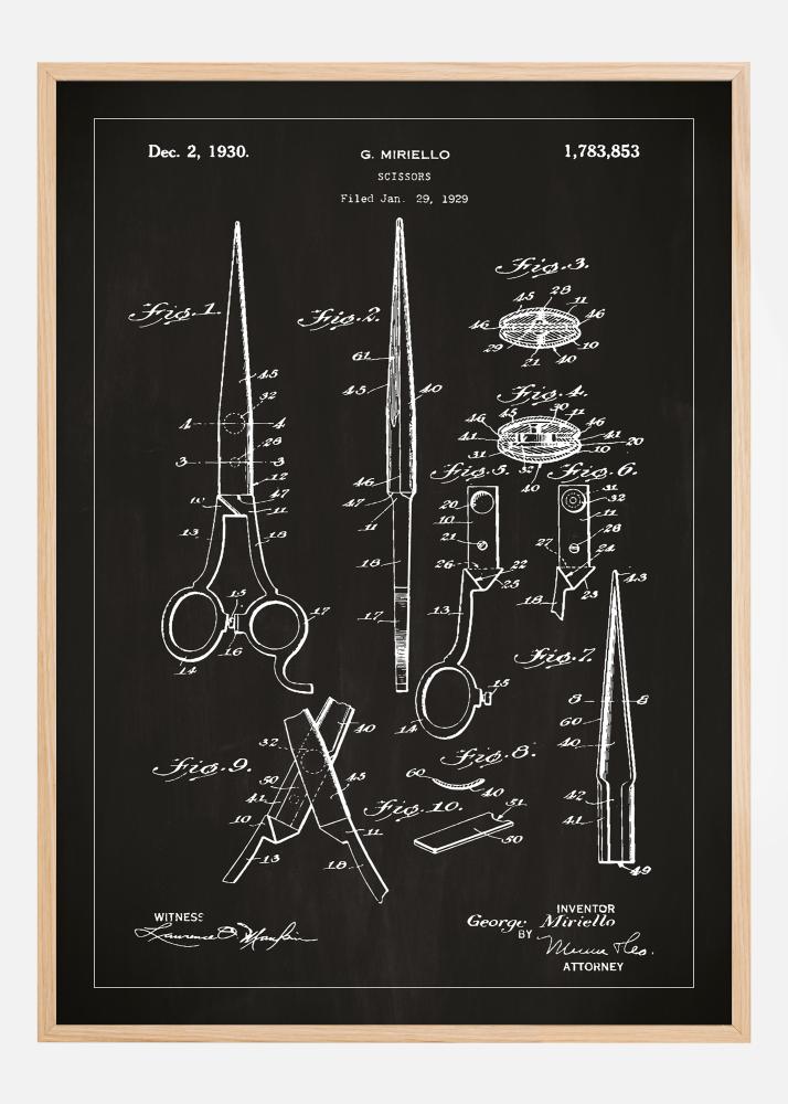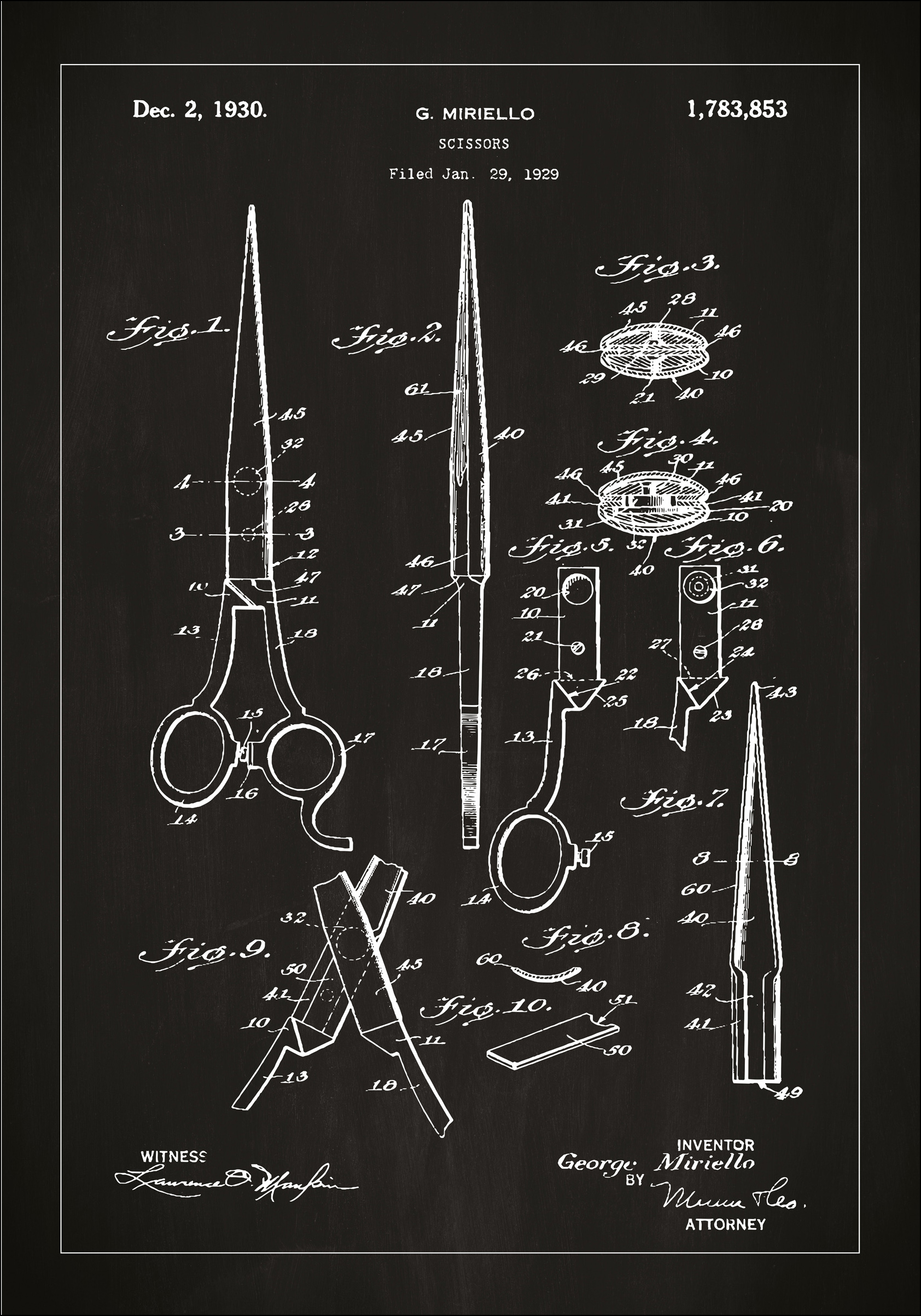 Tento výrazný patentový plakát je poctou klasickému designovému ikoně - nůžkám. Zobrazuje patent G. Mirella, který byl vydán 2. prosince 1930 s patentovým číslem 1,783,853, po podání 29. ledna 1929. S pečlivými náčrty, které ukazují různé úhly a části nůžek, od špičatých čepelí po ergonomicky navržené rukojeti, tento patentový výkres zachycuje samotnou podstatu řemeslné práce a designu.
