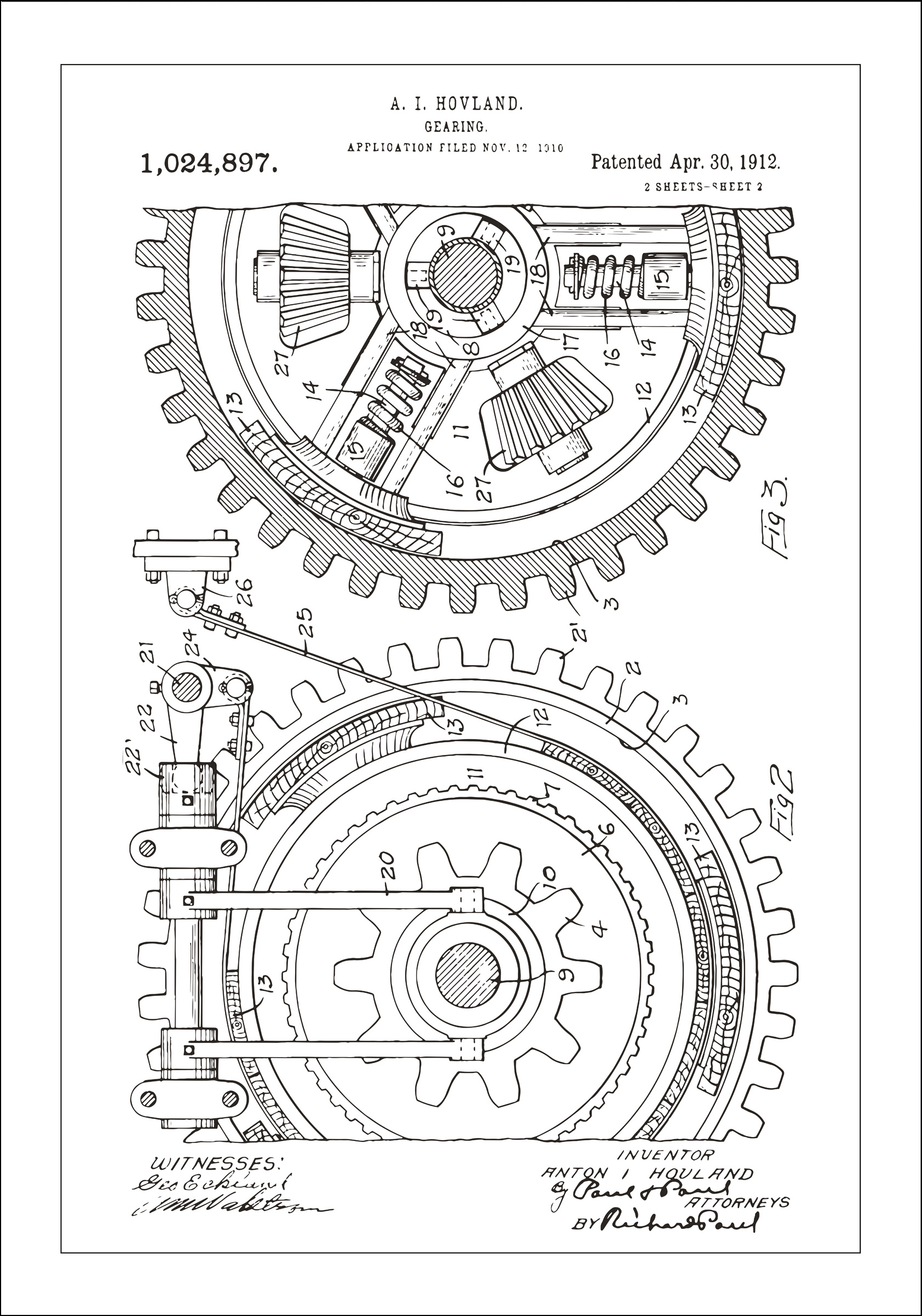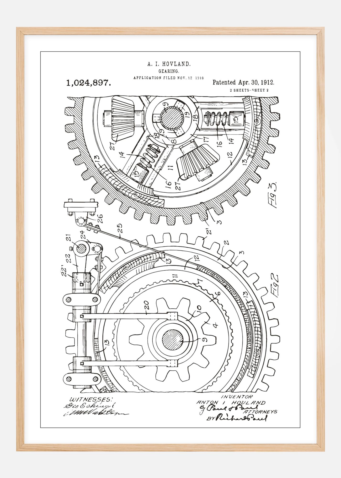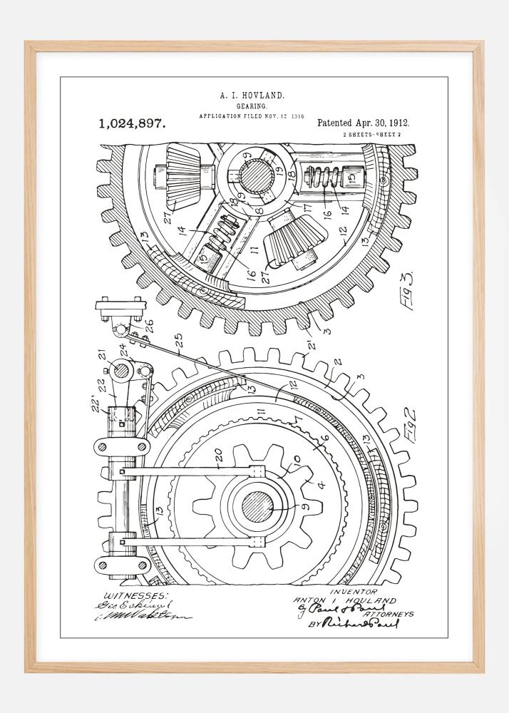 Ozdobte svou zeď tímto klasickým patentovým plakátem, který představuje složitý návrh převodovky A. I. Hovlanda, patentové číslo 1,024,897, udělený 30. dubna 1912. Tento podrobný výkres zdůrazňuje technickou zručnost a složitost raných mechanických konstrukcí. Jemné linie a pečlivé detaily tohoto patentového výkresu nabízejí hlubší pochopení historie inženýrství a jsou důstojným doplňkem každého technického nebo průmyslového stylu interiéru.
