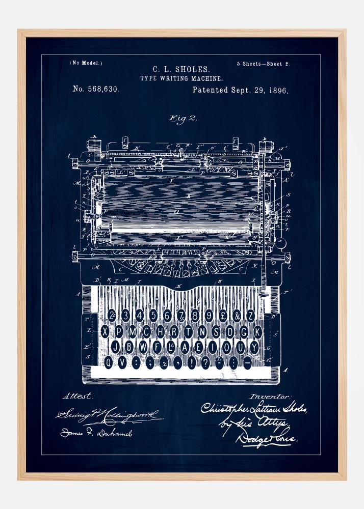 Obdivujte tento výrazný patentový plakát, který zobrazuje historický vynález psacího stroje, patent číslo 568 630, udělený C. L. Sholesovi dne 29. září 1896. Tento patentový výkres není jen vizuální reprezentací raného strojového zařízení na psaní, ale také kouskem historie komunikace, prezentovaný zde v zářivě bílé linii na námořnicky modrém pozadí, což vytváří silný a atraktivní kontrast.