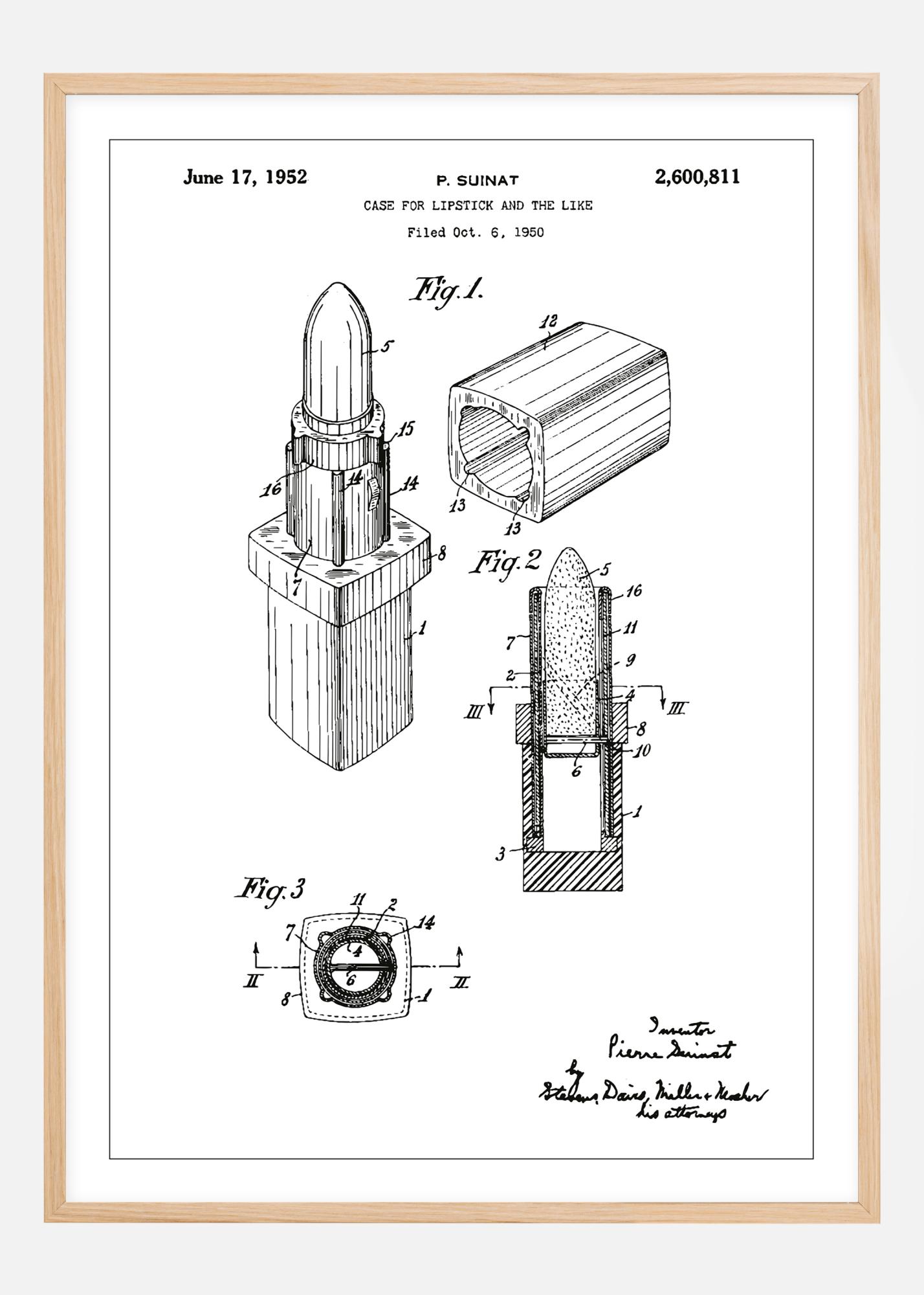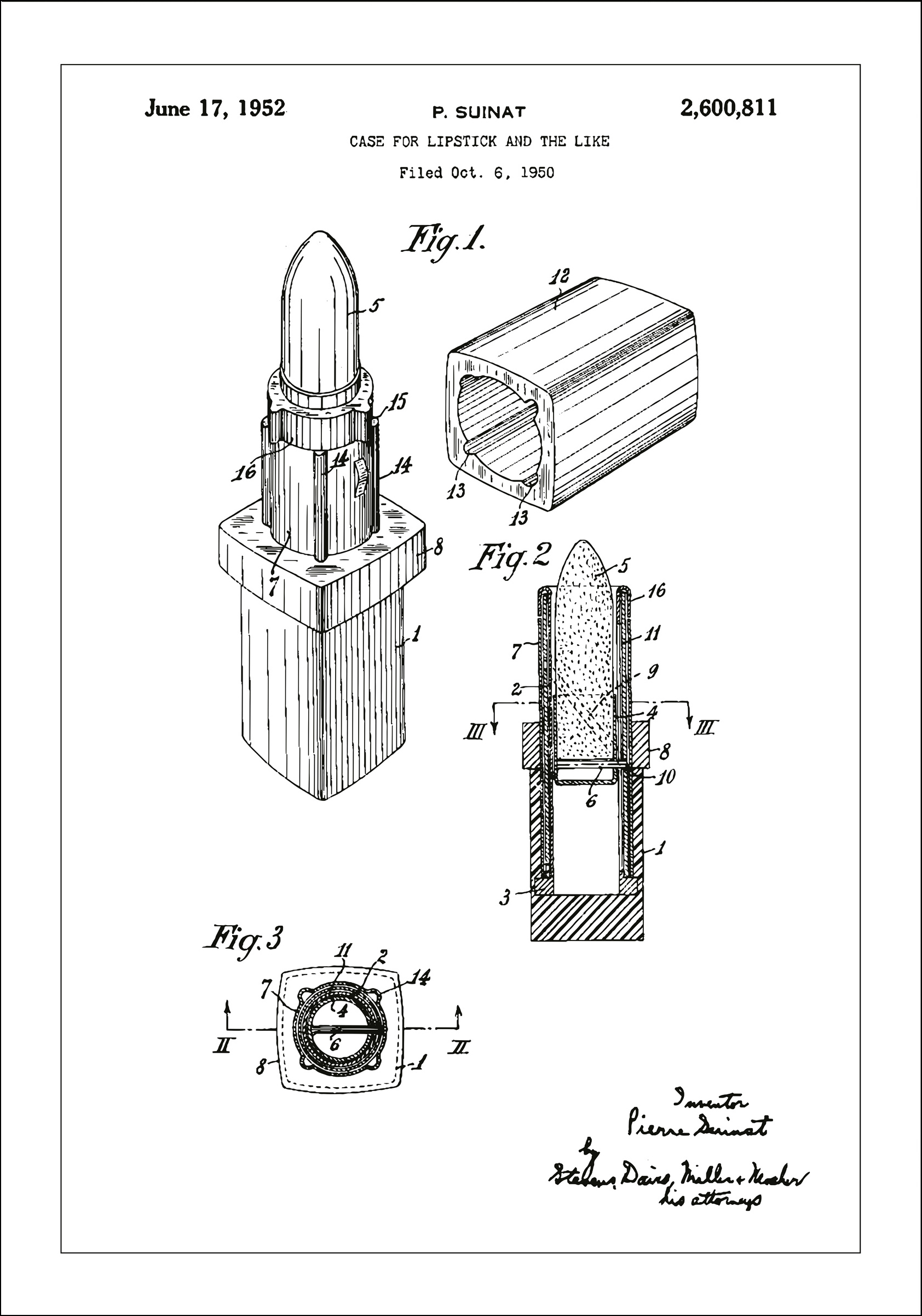Tento stylový patentový plakát znázorňuje inovativní design pouzdra na rtěnku, který byl udělen P. Suinatovi pod patentovým číslem 2,600,811 dne 17. června 1952, po podání žádosti dne 6. října 1950. Detailní ilustrace ukazuje klasický design kosmetického doplňku, který poskytuje pohled do technického a estetického vývoje kosmetického průmyslu. Čisté linie a pečlivé zpracování plakátu z něj činí perfektní interiérový prvek pro kosmetické salony, make-up studia nebo jako unikátní nástěnné umění pro všechny, kteří ocení vintage kosmetické doplňky a design.