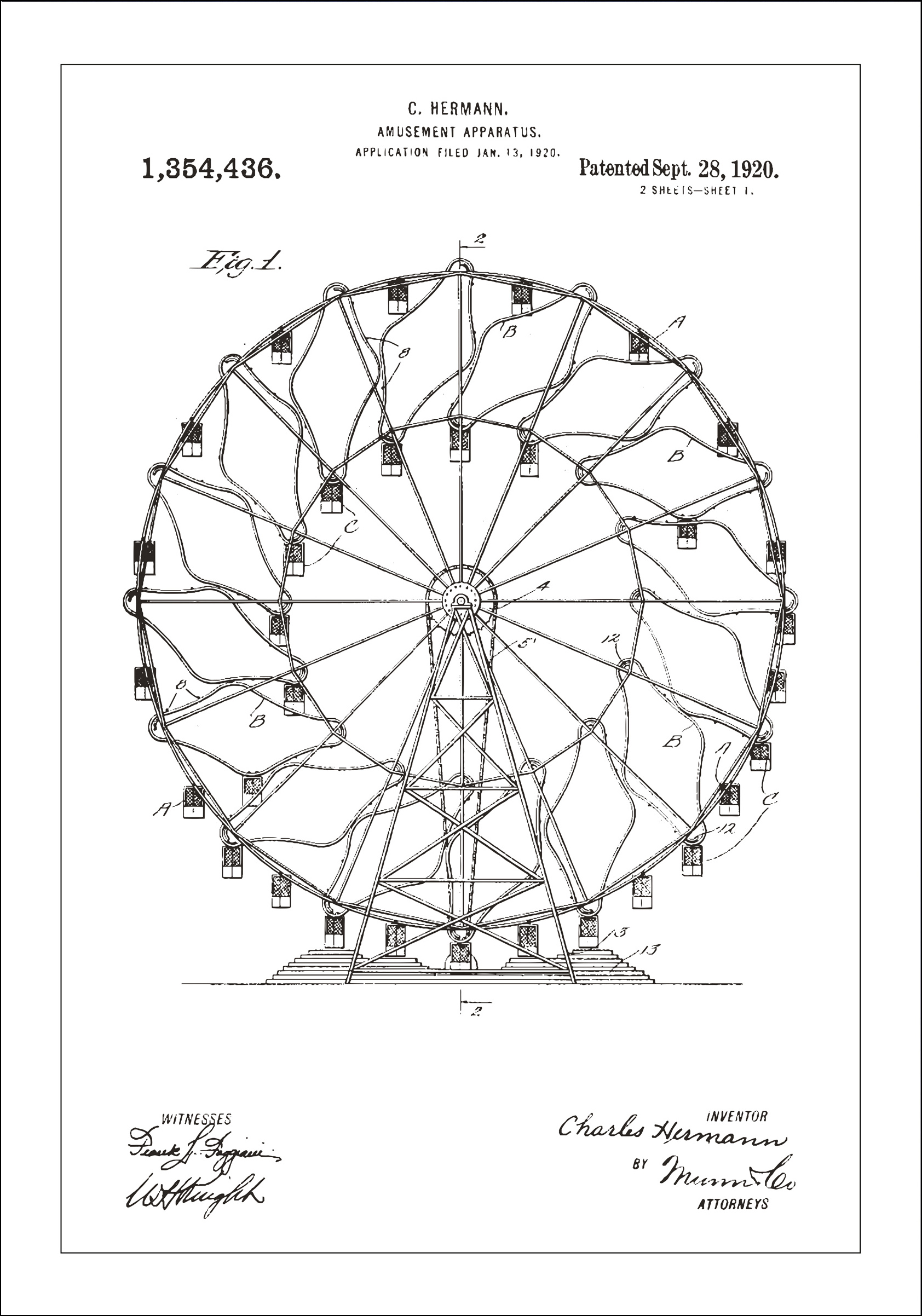 Tento patentový plakát zobrazuje vynález C. Hermanna, zábavní zařízení navržené pro radost a vzrušení, udělené pod patentovým číslem 1,354,436 dne 28. září 1920. Návrh představuje klasické a oblíbené ruské kolo, symbol zábavních parků po celém světě. Tento pečlivý technický výkres zachycuje složitost struktury a je poctou raným dnům zábavního průmyslu.