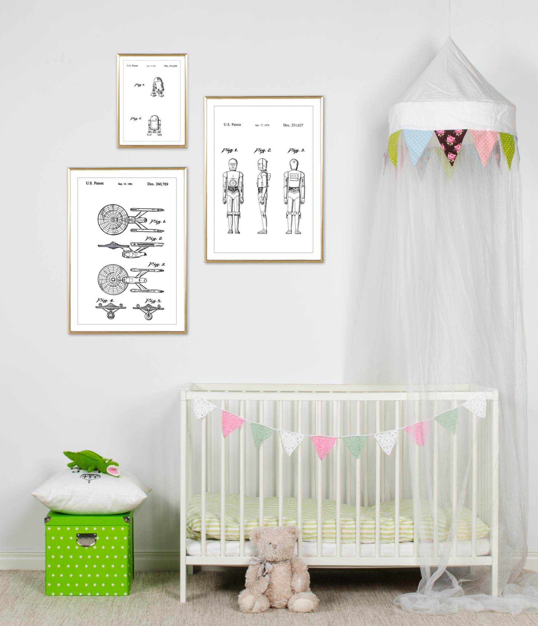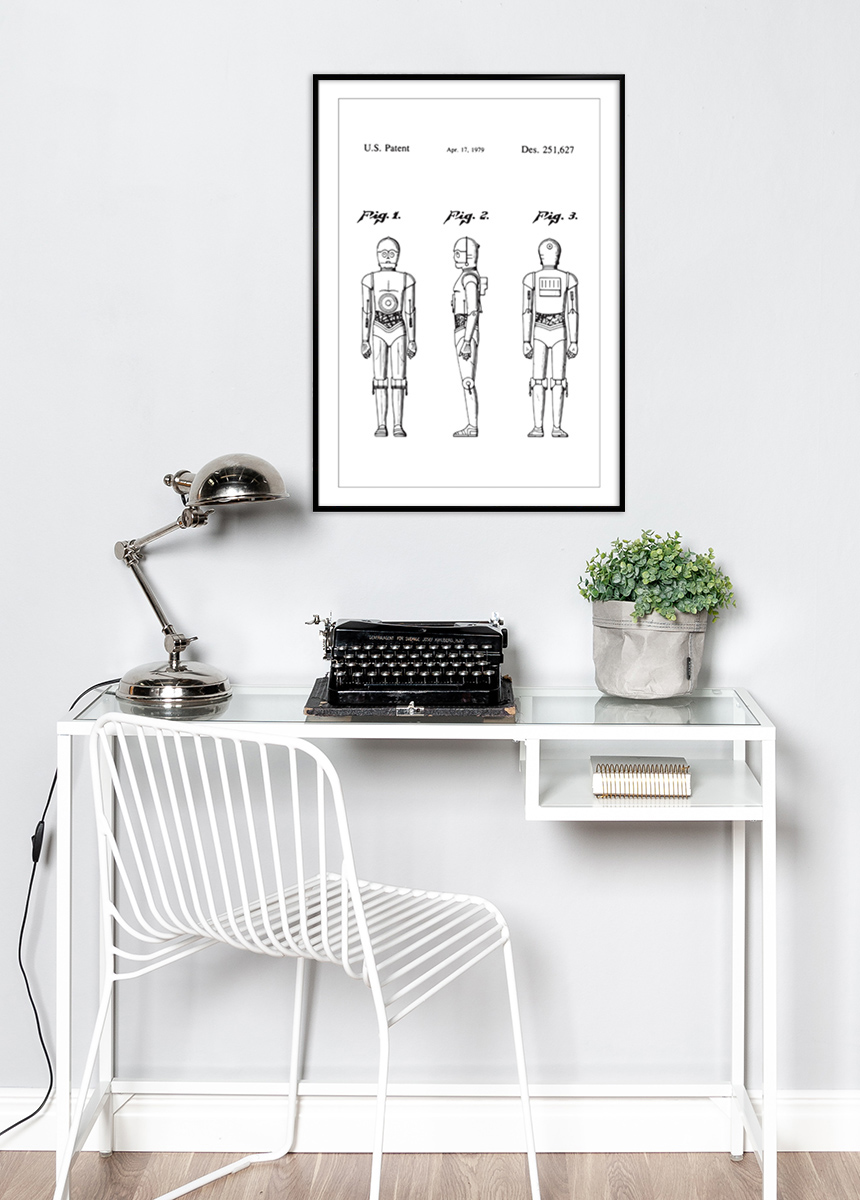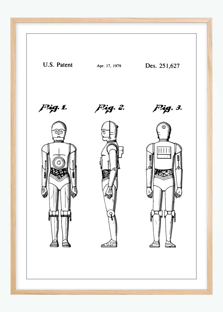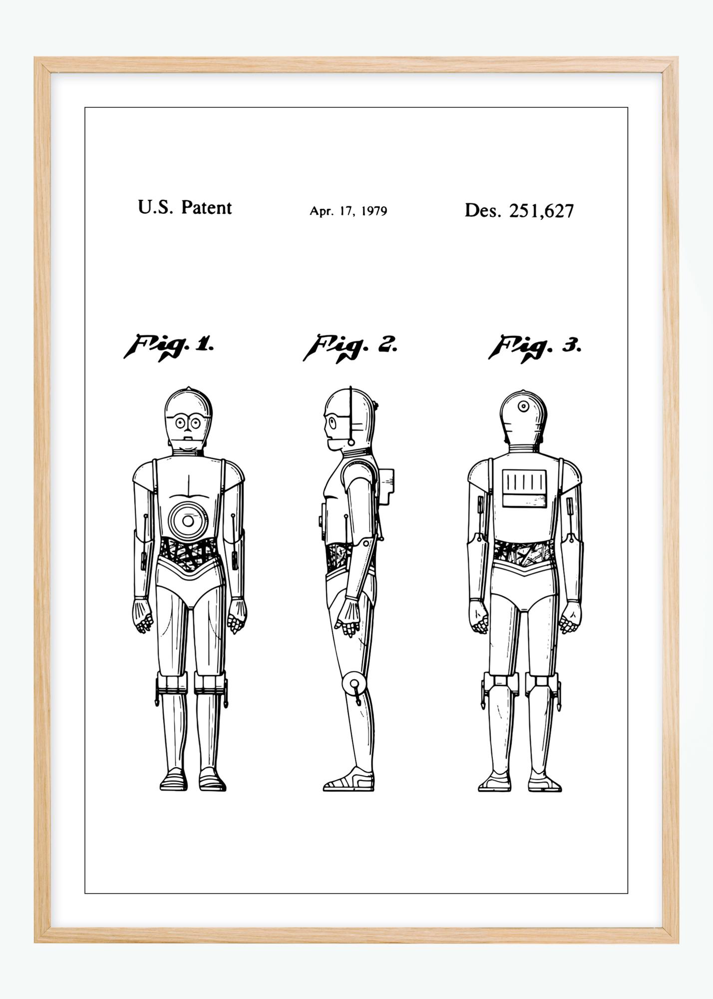 Tento unikátní patentový plakát zobrazuje C3PO ze Star Wars s americkým patentem Des. 251,627, uděleným 17. dubna 1979. Postava je zobrazena ze tří různých úhlů, což poskytuje kompletní přehled o jejím designu. Tento plakát zachycuje rané nadšení pro robotiku a její potenciální využití. Se svou detailní a technicky zpracovanou ilustrací je ideální nástěnnou dekorací pro technické nadšence a fanoušky retrofuturismu.