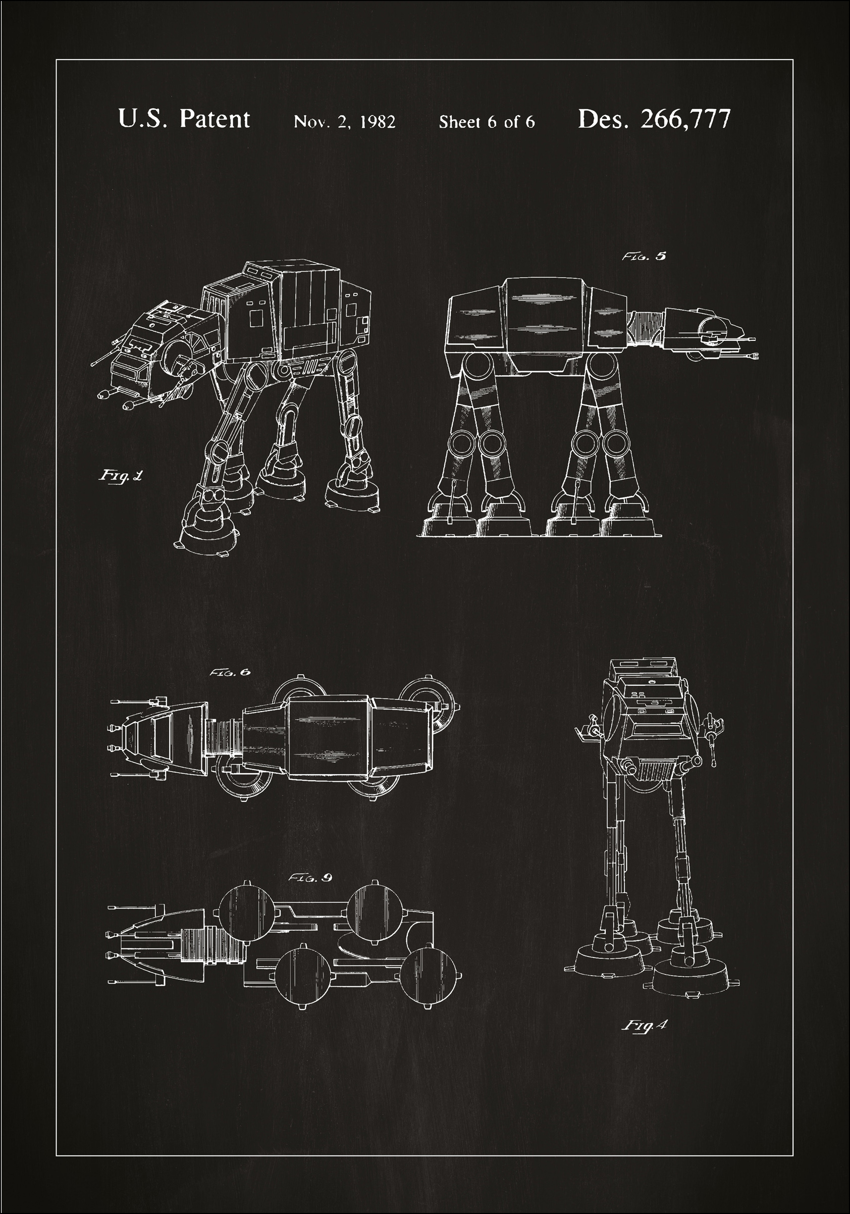 Objevte naši jedinečnou kolekci patentových výkresů, které proměňují ikonické inovace na umění pro váš domov nebo kancelář. Tento specifický patentový plakát zobrazuje ATAT z Hvězdných válek. Zde naleznete působivou sbírku konstrukčních ilustrací ze známého patentu, Des. 266,777, datovaného 2. listopadu 1982. Každý detailní výkres vytváří vizuální příběh techniky a inženýrství, což z něj činí dokonalý sběratelský objekt nebo podnětný dar pro nadšence do technologií.