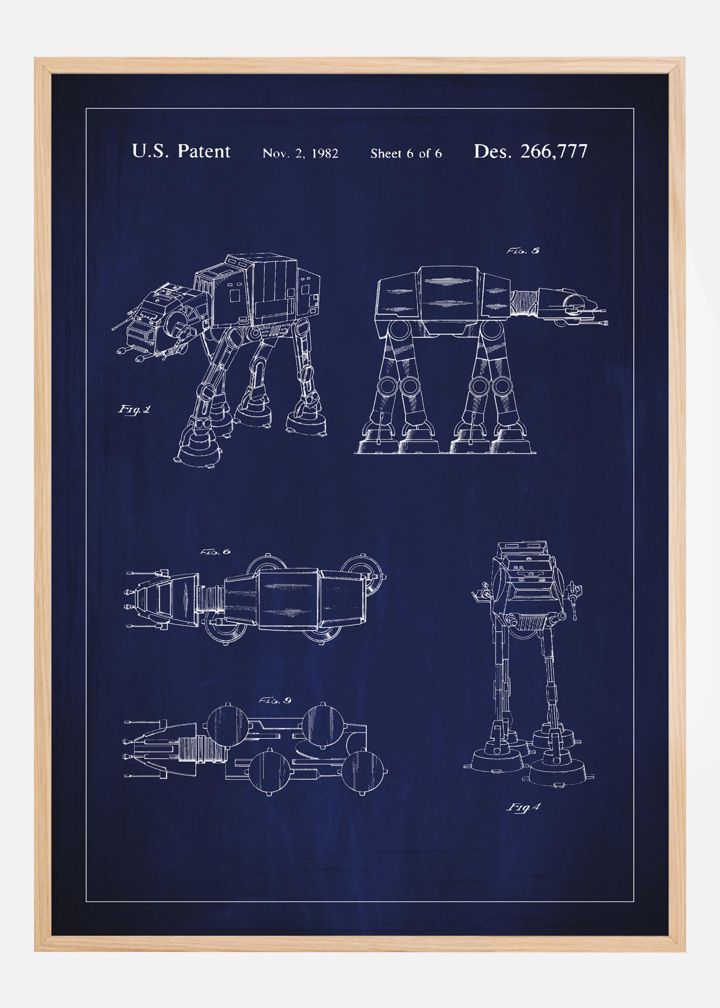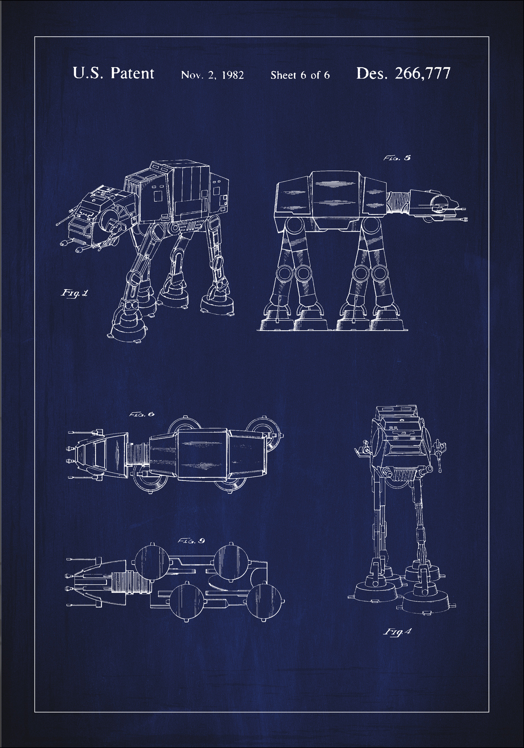 Tento umělecký patentový plakát zobrazuje výrazné konstrukční výkresy ze slavného designového patentu Des. 266,777, zaregistrovaného 2. listopadu 1982. Motiv ukazuje technické výkresy ATAT ze Star Wars v několika pohledech, z nichž každý demonstruje jedinečnou strukturu a funkce zařízení. Je prezentován na tmavomodrém pozadí, které dodává elegantní a moderní výraz bílými liniemi ilustrovaným kresbám.