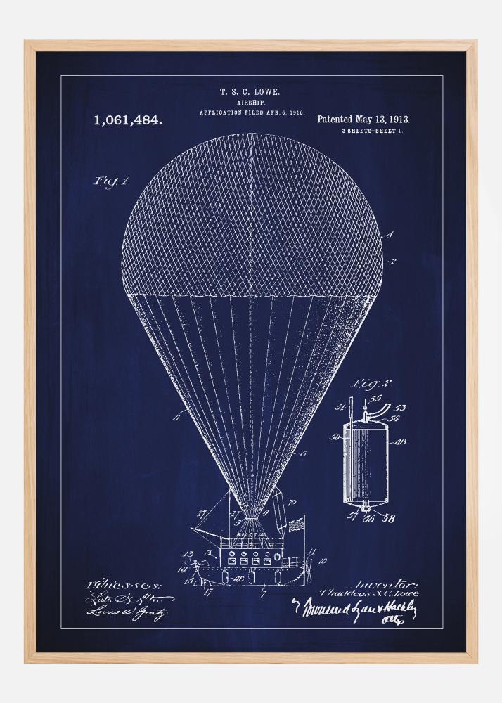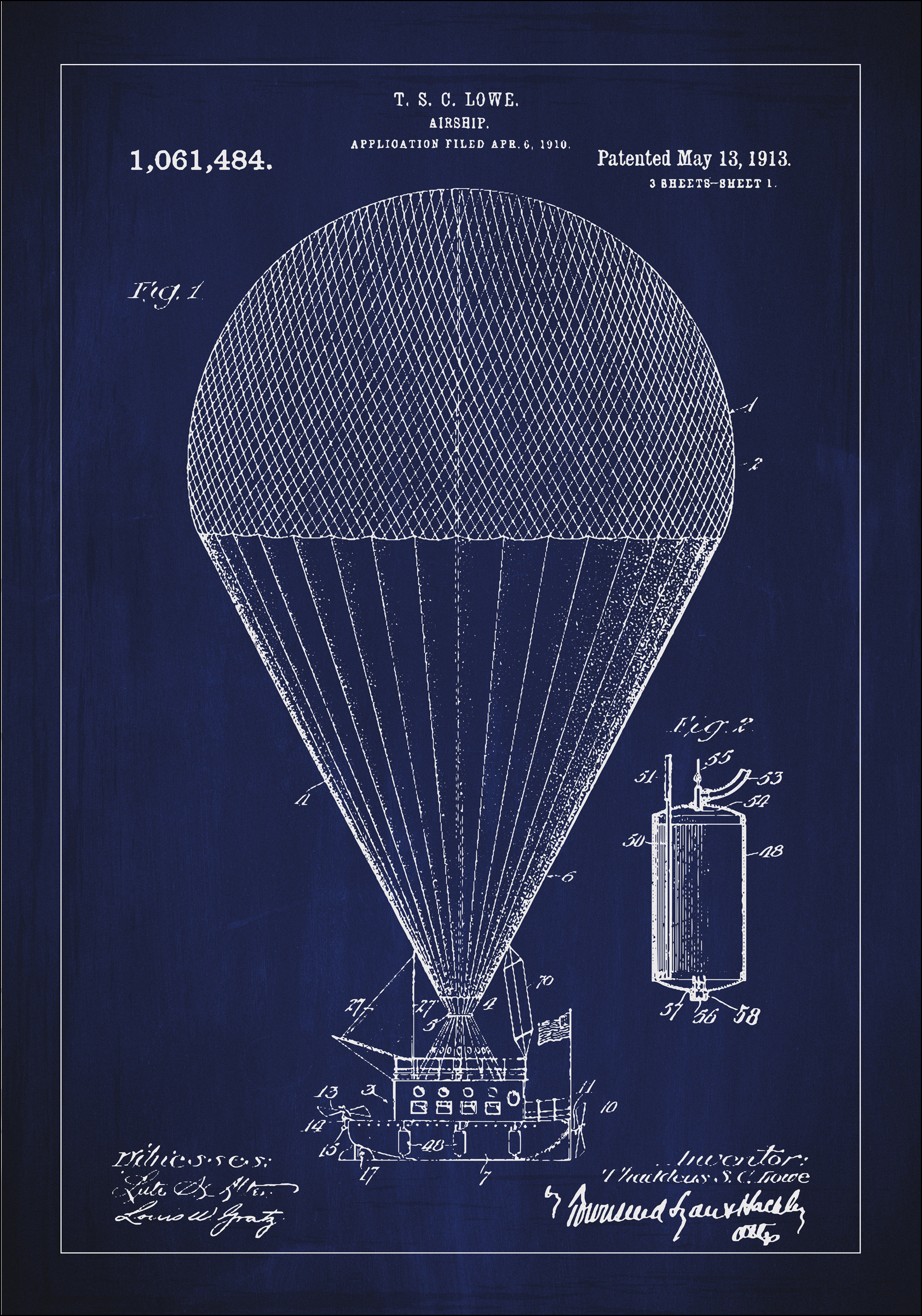 Jsme hrdí na to, že vám můžeme představit tento patentový plakát znázorňující vzducholoď T. S. Lowea, vynález, který znamenal pokrok v raném letectví. Patent s číslem 1,061,484 byl udělen 13. května 1913 a přináší s sebou dobu dobrodružství a inovace. Tento plakát je poctou kreativnímu duchu a technickým snům počátku 20. století.