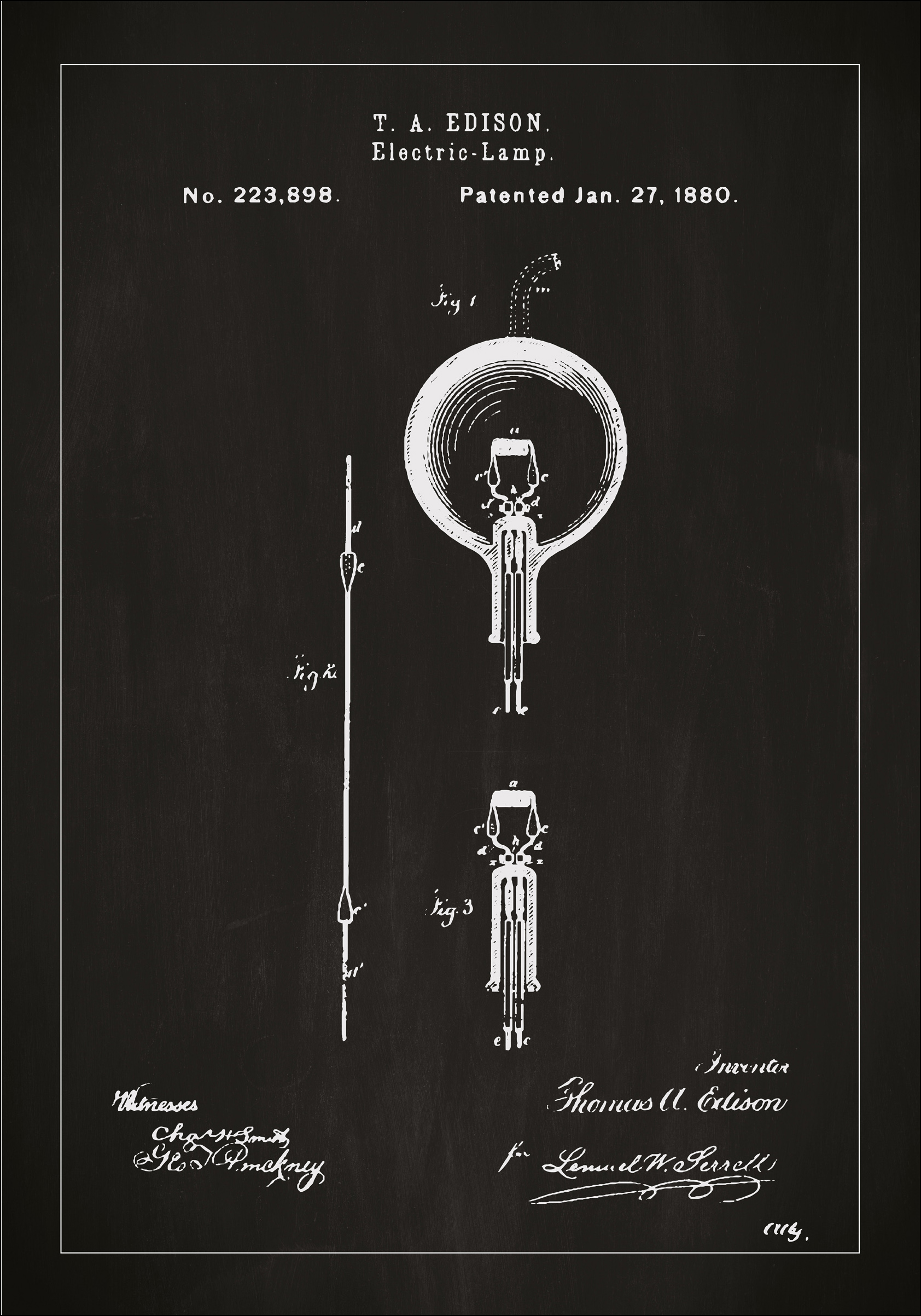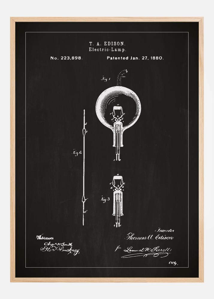 Tento výrazný patentový plakát zdůrazňuje průkopnický design elektrické lampy Thomase A. Edisona, ikonický průlom v historii technologie. S patentovým číslem 223,898, uděleným 27. ledna 1880, je tento patentový výkres reprezentací revolučního vynálezu, který změnil způsob, jakým lidstvo vnímá světlo. Ilustrace sama o sobě je umělecké dílo, které zobrazuje Edisonovu originální konstrukci s elegancí a smyslem pro detail, což z ní činí ideální dekorativní prvek pro všechny prostory, a zejména pro ty, kteří oceňují vědeckou inovaci a design.