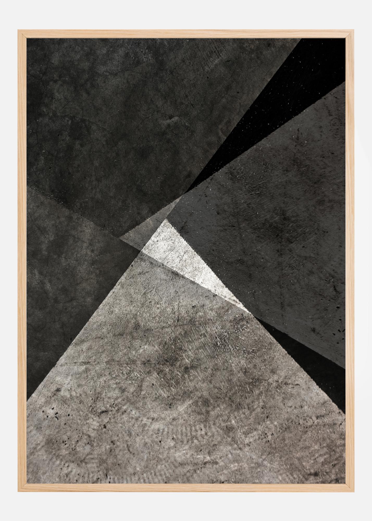 Záhadný tisk s černobílými trojúhelníkovými tvary umístěnými na podlaze. S přirozeným světlem, které osvětluje dlaždice, není jasné, zda je menší trojúhelník bílý, nebo zda je jen osvětlen světlem. Toto je ideální plakát k pověšení na hladkou stěnu.