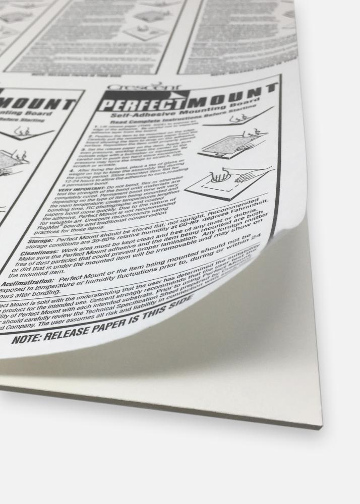 Perfect Mount je 1,4 milimetru silná montážní deska s oboustranným lepidlem pro montáž obrázků a fotografií. Deska je samozřejmě bez kyselin a pH neutrální pro co nejlepší zachování vašich obrázků. Lepidlo na desce je aktivováno tlakem, což znamená, že můžete obrázek přikládat a odstraňovat, dokud nebudete spokojeni. Pro odstranění případných bublin lze přejet měkkým hadříkem nebo bavlněnou rukavicí přes povrch obrázku, od středu ven. Deska se poté položí pod tlak, aby byl obrázek připevněn natrvalo.