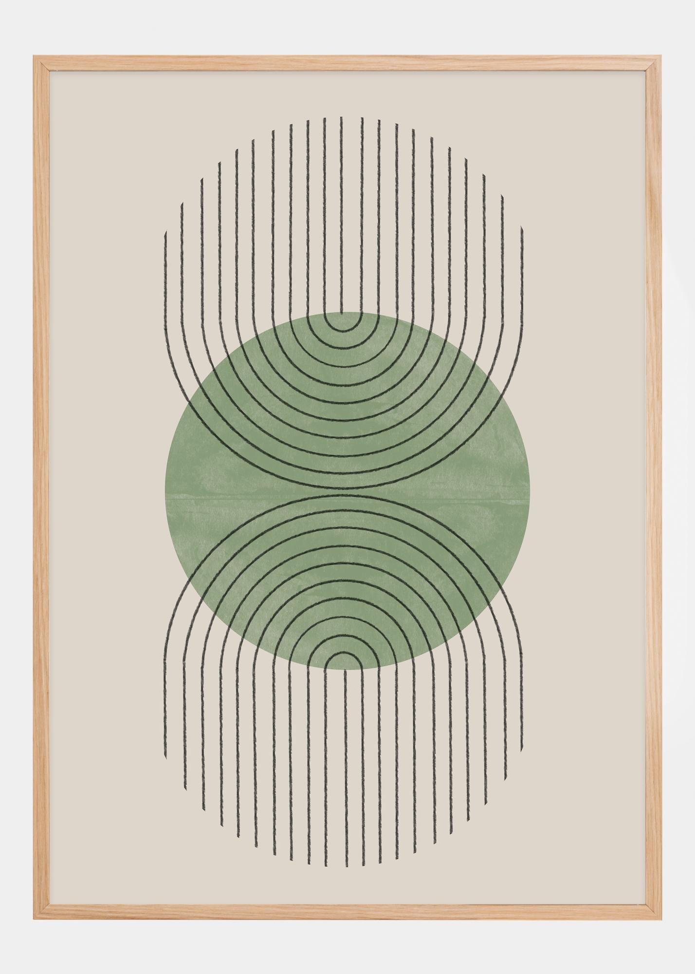Tento plakát je minimalistické umělecké dílo, které zdůrazňuje sytou zelenou kruhovou formu obklopenou sérií černých linek, což vyvolává pocit prostoru a hloubky. Zelený odstín kruhu se liší intenzitou, což vytváří vizuální efekt dimenze a textury. Linky, které se táhnou od okraje kruhu, vytvářejí téměř hypnotický efekt a představují geometrickou harmonii.