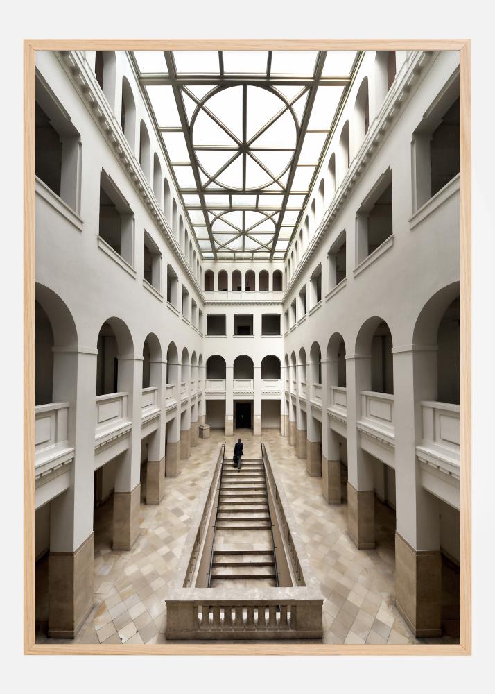 Velkolepý plakát s budovou od Petera Behrense. Béžový a bílý interiér zachycuje postavu, která stoupá po schodech. Průhledná střecha osvětluje detaily architektury s kruhovými a čtvercovými okny, která propouštějí světlo. Vytvořte stylovou atmosféru s tímto úžasným tiskem.