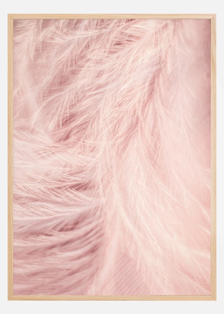 Úžasný plakát s makro fotografií jemných růžových peříček. Díky silnému světlu, které svítí na peří, není jasné, zda je peří skutečně růžové nebo bílé. Je to růžové světlo, které se odráží na peří? Pověste tento plakát ve svém domově pro jemný teplý pocit.