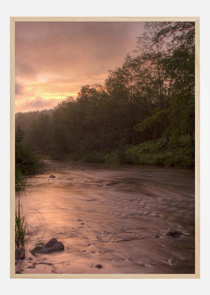 Úžasný tisk bahnité řeky, která protéká lesem. Oranžové večerní slunce klesá skrz mraky a dodává snímku jemný nádech oranžové. Zavěste tento magický plakát do obývacího pokoje a následujte proud.