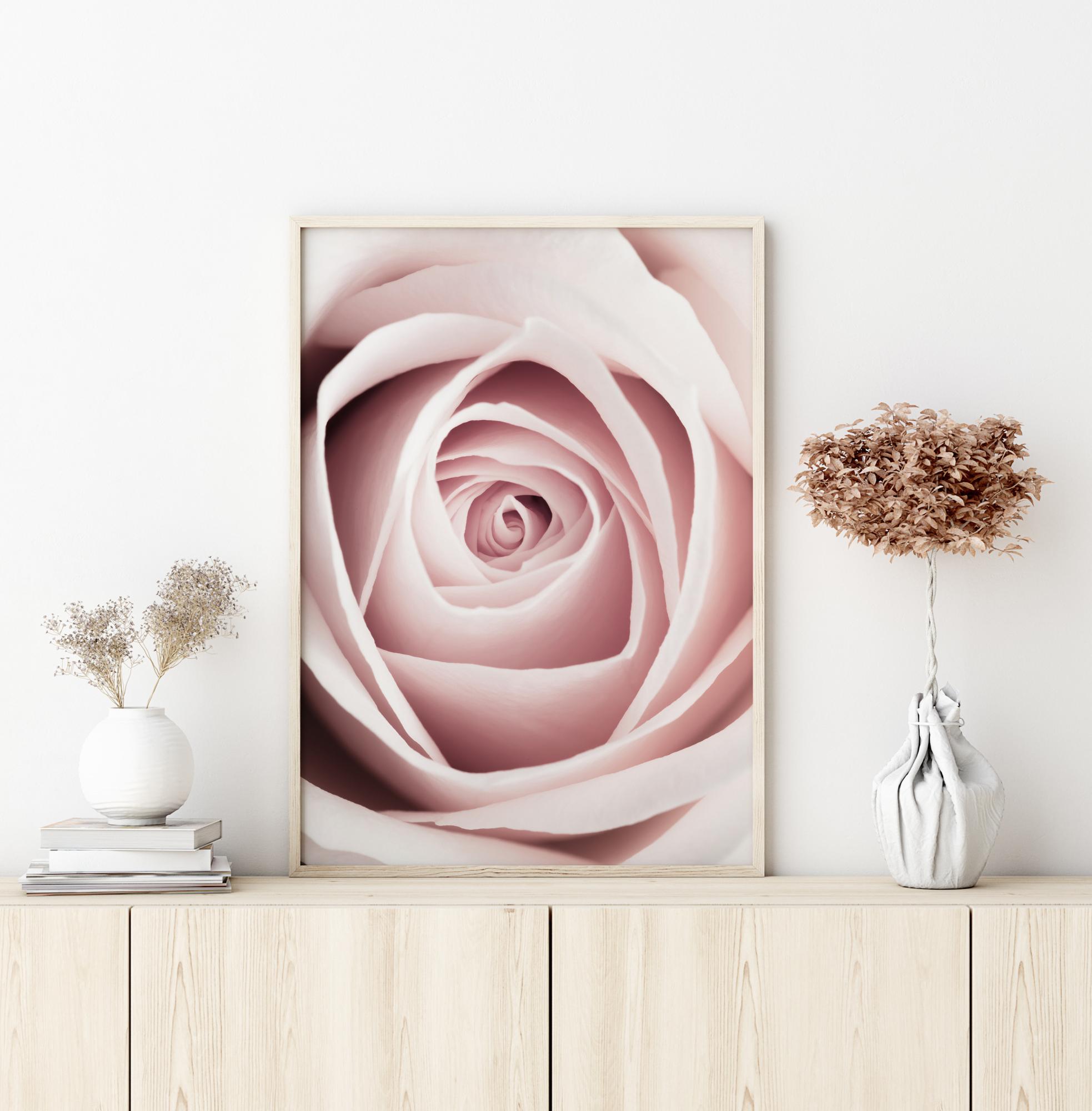 Ohromující krásný tisk malé růžové růžové poupátko. Krásné měkké tóny růže vytvářejí pocit tepla a hloubky. Pověste tento jemný plakát na stěnu vaší ložnice a přeneste krásu této květiny do svého domova.
