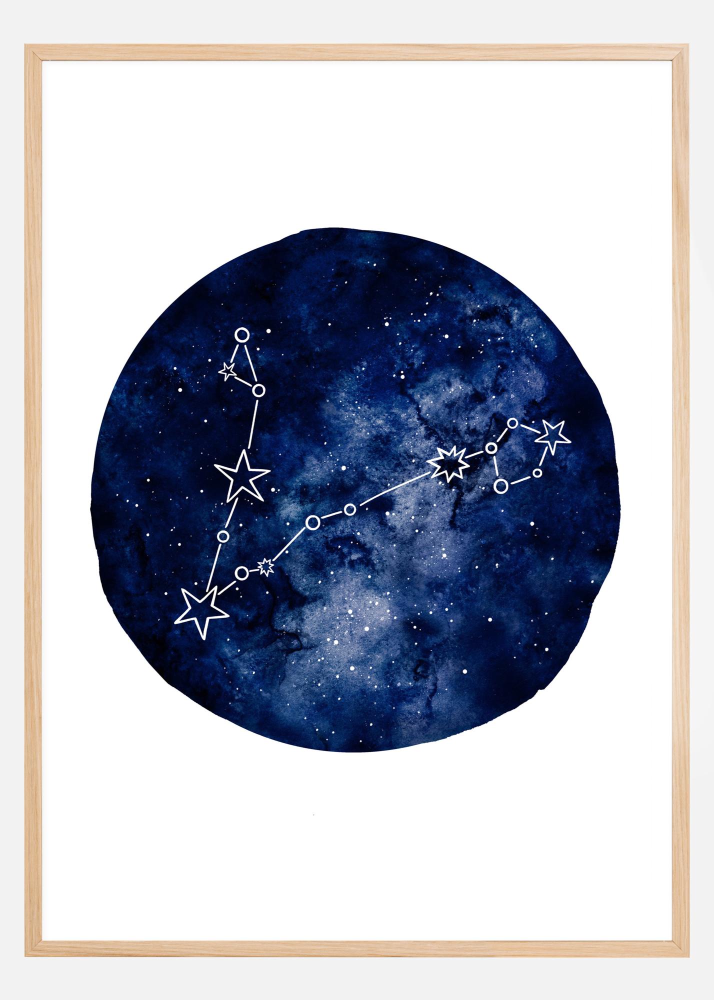 Působivý astrologický tisk, který ilustruje znamení zvěrokruhu Ryby. Na bílém pozadí je tmavě modrý obraz souhvězdí jasně zvýrazněn bílými pěti hvězdami. Fascinující plakát pro každého, kdo se zajímá o astrologii nebo astronomii. Perfektní tisk na zavěšení ve vaší pracovně.