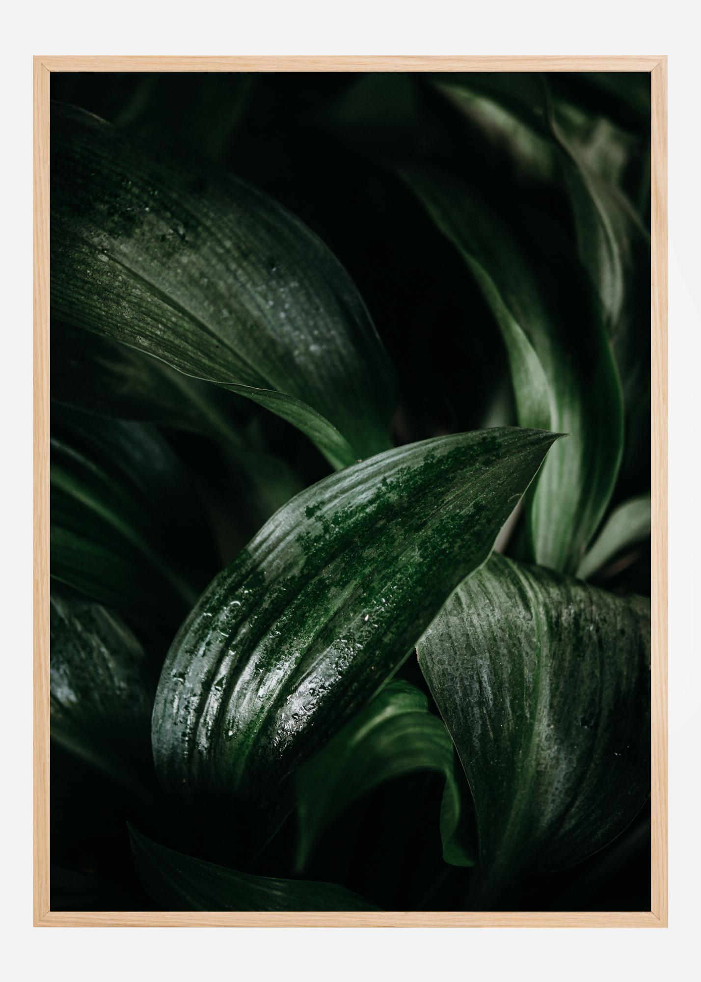 Detailní pohled na mokré listy, které těsně spolu pokrývají plakát. Kapky vody na listech vytvářejí lesklou atmosféru. Tmavé, rozmazané pozadí zobrazuje další listy, které se snaží být vidět. Tato dokonalá krása je ideální pro váš domov.