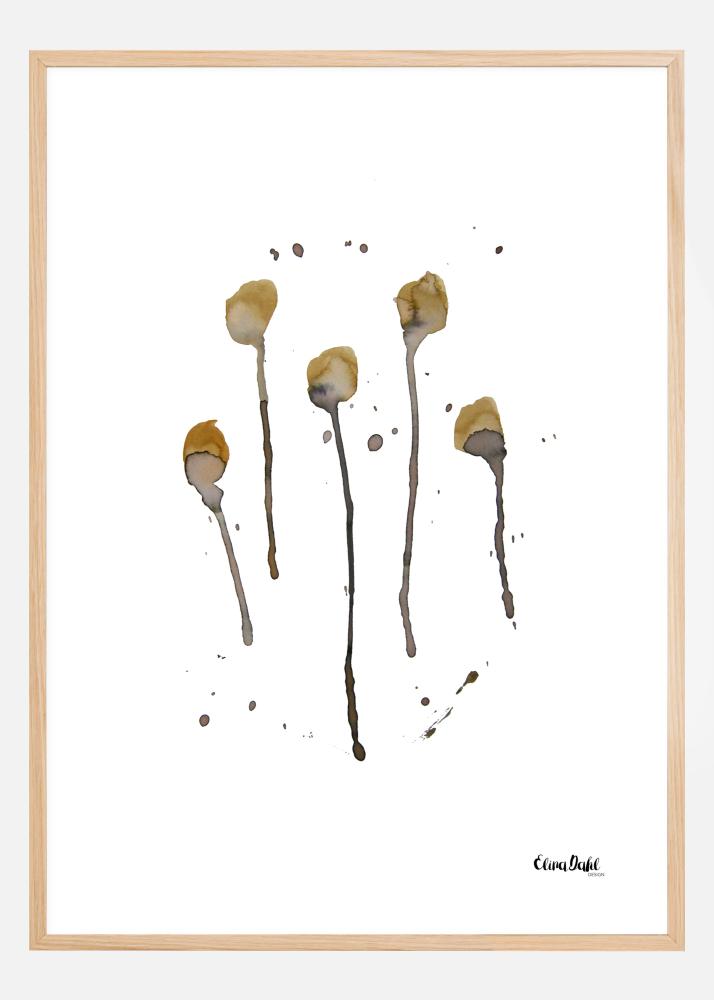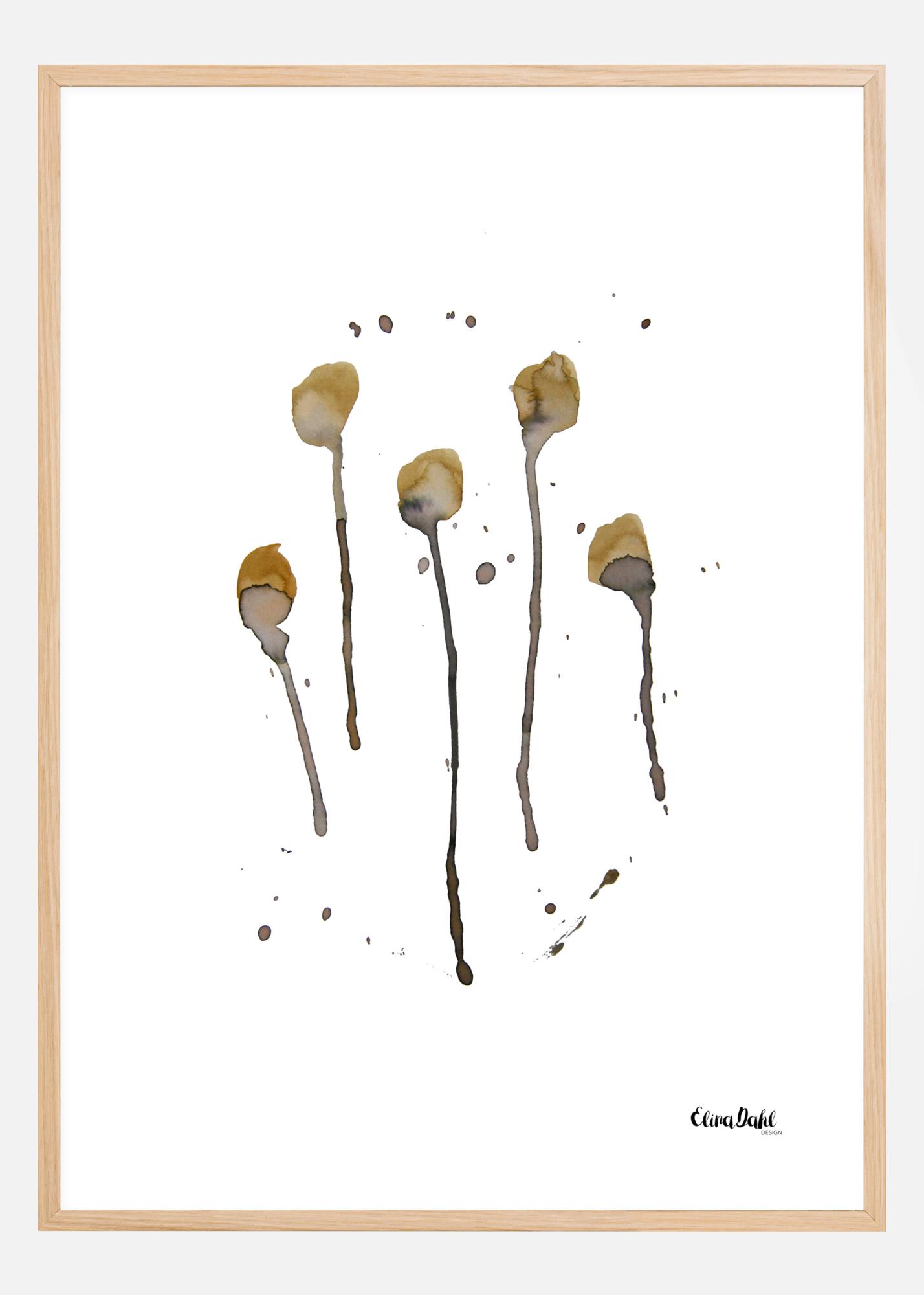 Botanický tisk s pěti malými květními stonky. Umístěné na bílém pozadí stojí těchto pět hnědých a šedých květních stonků vzpřímeně ve středu plakátu. Hnědé skvrny obklopují stonky náhodně. Skvělý plakát pro všechny, kteří milují rostliny.