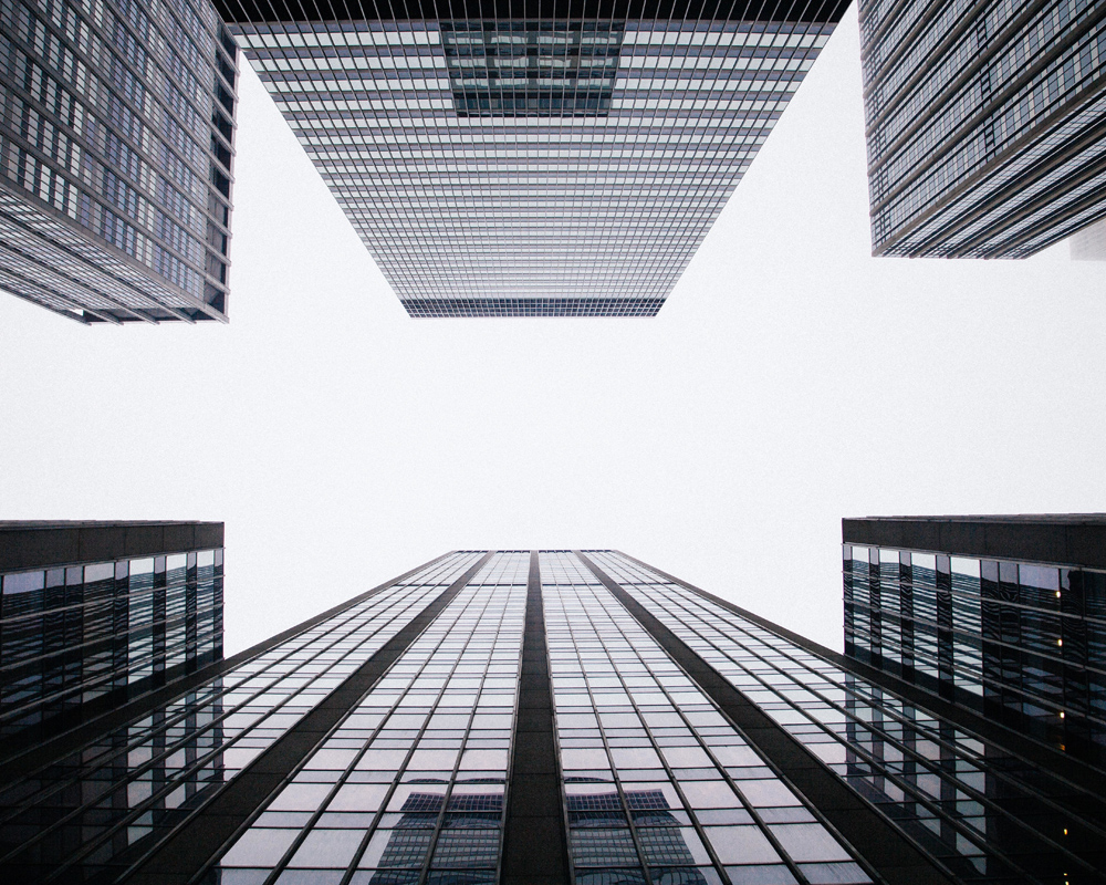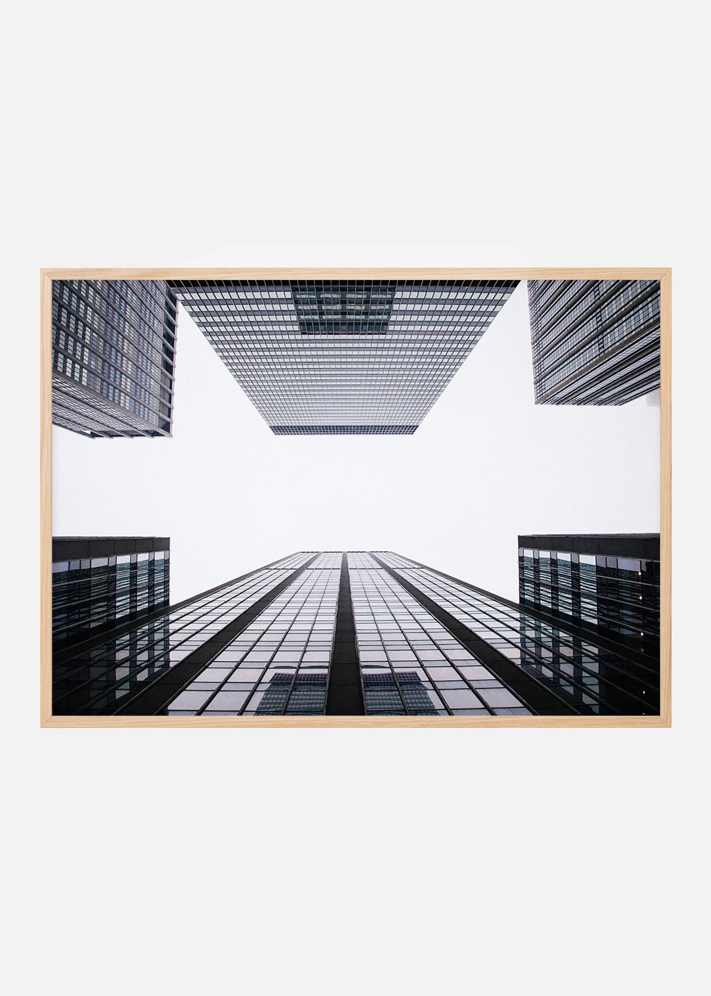 Architektonický plakát s rostoucími mrakodrapy proti oblacímu bílému nebi. Stylový obraz tmavých budov proti bílému pozadí s odrazy nebe ve skleněných oknech. Perfektní dárek pro ty, kteří mají rádi grafické portréty budov. Tisk vypadá dobře v černém rámu, který posiluje tmavost obrazu a skvěle se hodí v kombinaci s dalšími fotografiemi architektury.