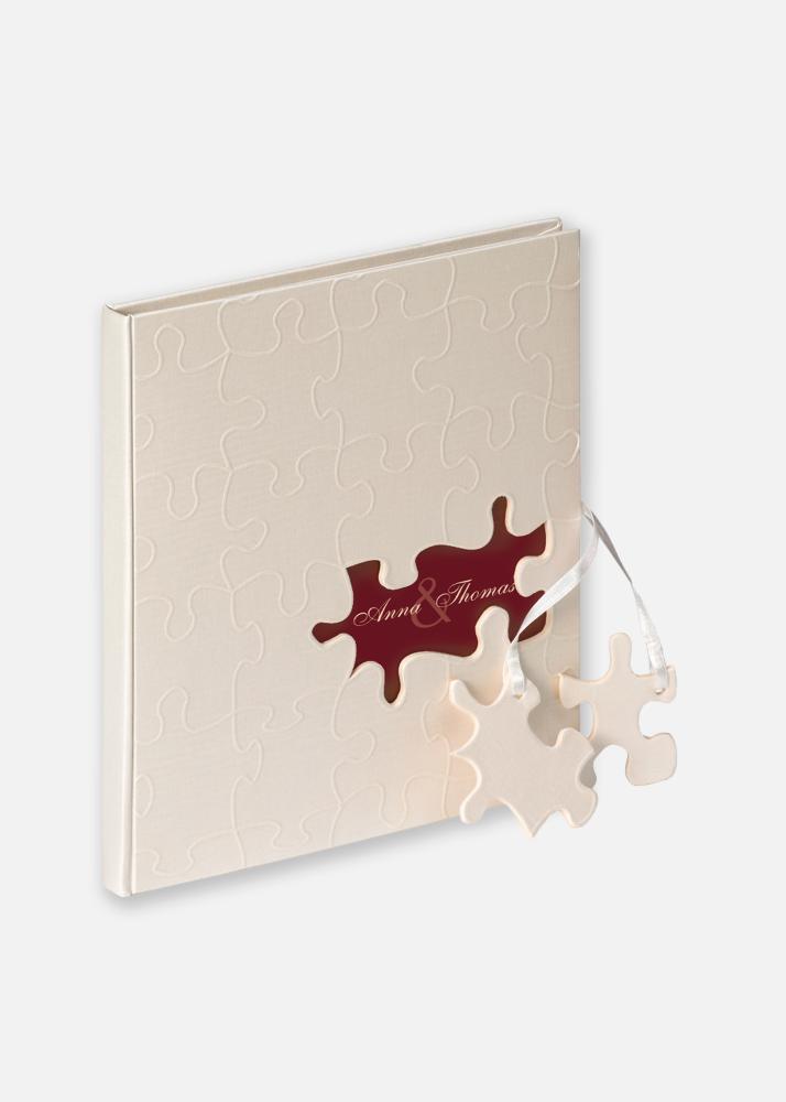 Kniha hostů s bílými a červenými lněnými deskami. Na přední straně knihy hostů je místo pro osobní fotografii nebo jméno svatebního páru. K dispozici je také odpovídající svatební album pro vaše svatební fotografie.